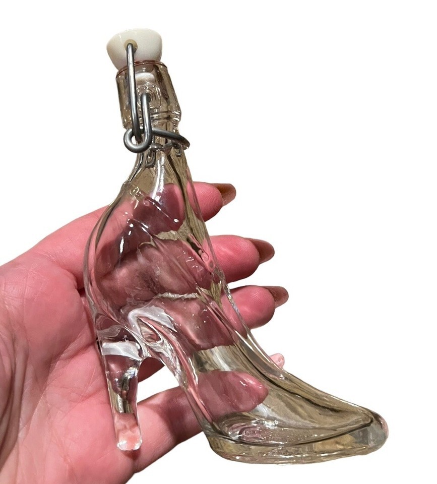 Glass high heel shoe bottle with bale wire clamp (flip top) attached stopper