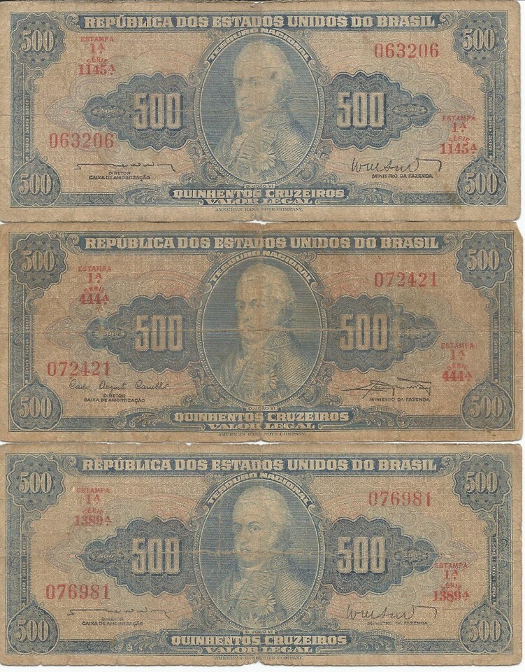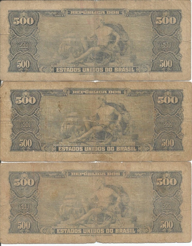 Brazil 1962 3x Circulated 500 CRUZEIROS CURRENCY BANKNOTE BRASIL P-172 # 18