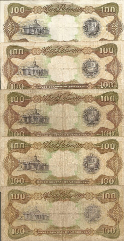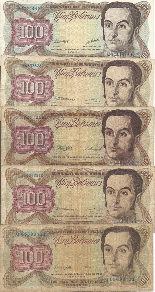 Venezuela 100 Cien Bolivares Cir. Mix Dates Five (5) Banknotes # 24