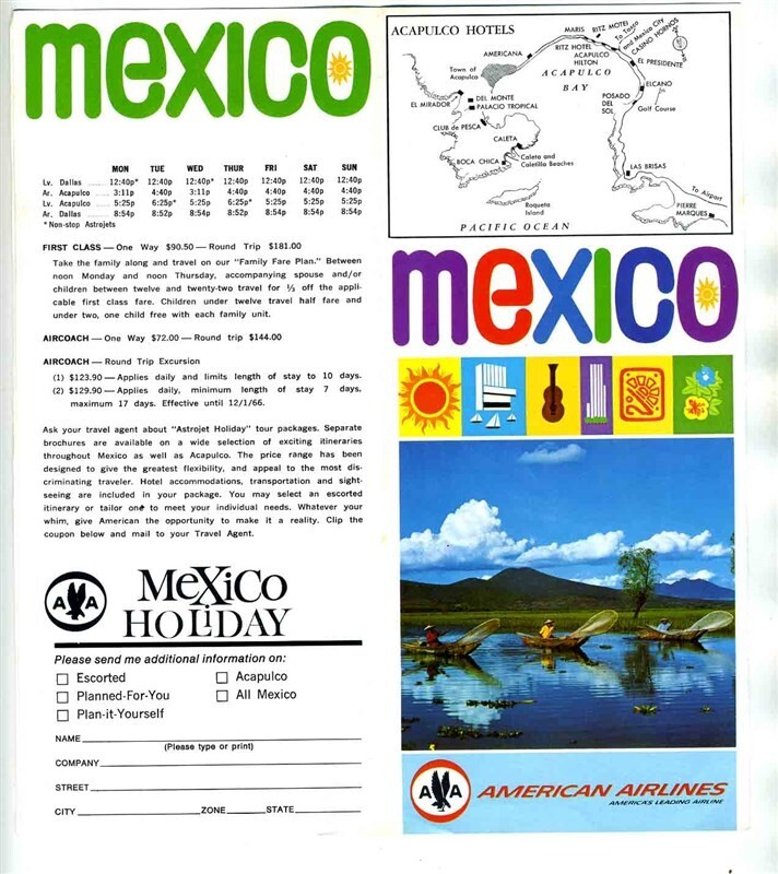 A full color 8 panel fold out brochure in fine condition. American Airlines Astrojet Facts About Acapulco Mexico. With fares, map, travel information and more. From 1966