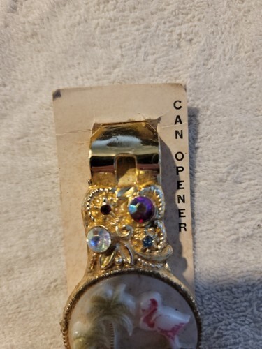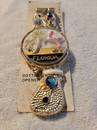 1959 Vaughan Chicago Gold Tone Jeweled bottle opener Florida.Nos on original packaging.Pkg has some stains and price on back,opener missing some paint on flamingo.