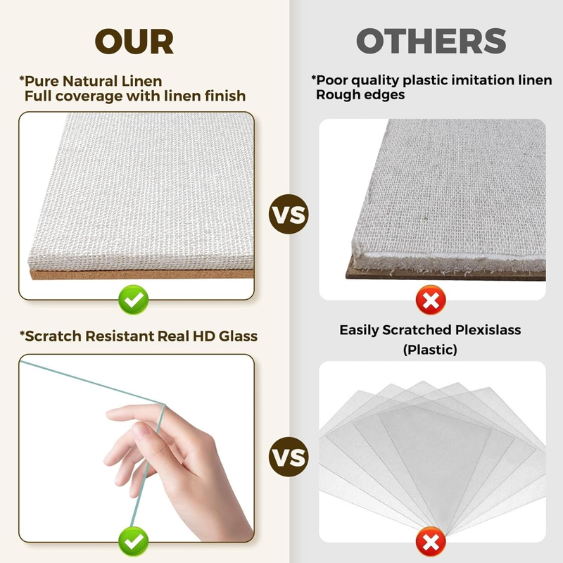 Includes - Removable HD glass cover, wood outer frame, removable wood inner frame, linen backboard, MDF backboard, metal suspension hook, mounting accessories