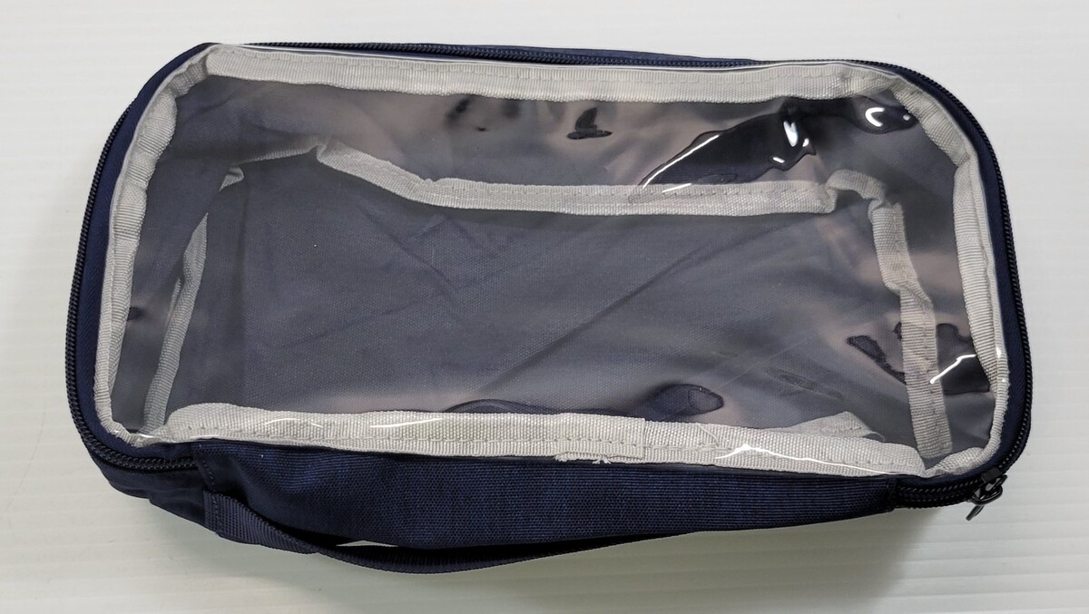 Clear vinyl cover toiletry/cosmetic bag measures about 11" x 6" x 3"