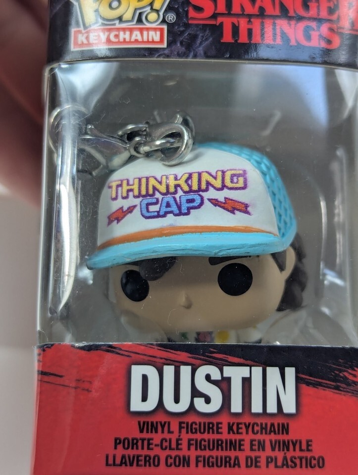 This Funko Pocket Pop! keychain features Dustin, a beloved character from the hit Netflix series Stranger Things. Crafted from durable vinyl, this mini figure showcases Dustin wearing his iconic "Thinking Cap" hat, capturing the essence of his quirky personality. The keychain includes a sturdy metal ring and clip, making it perfect for fans to carry their favorite character wherever they go.