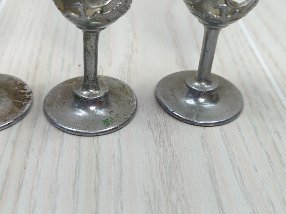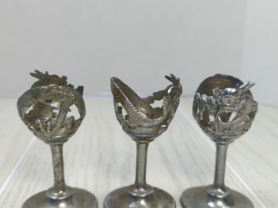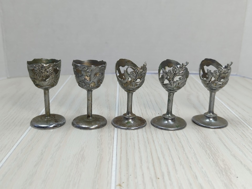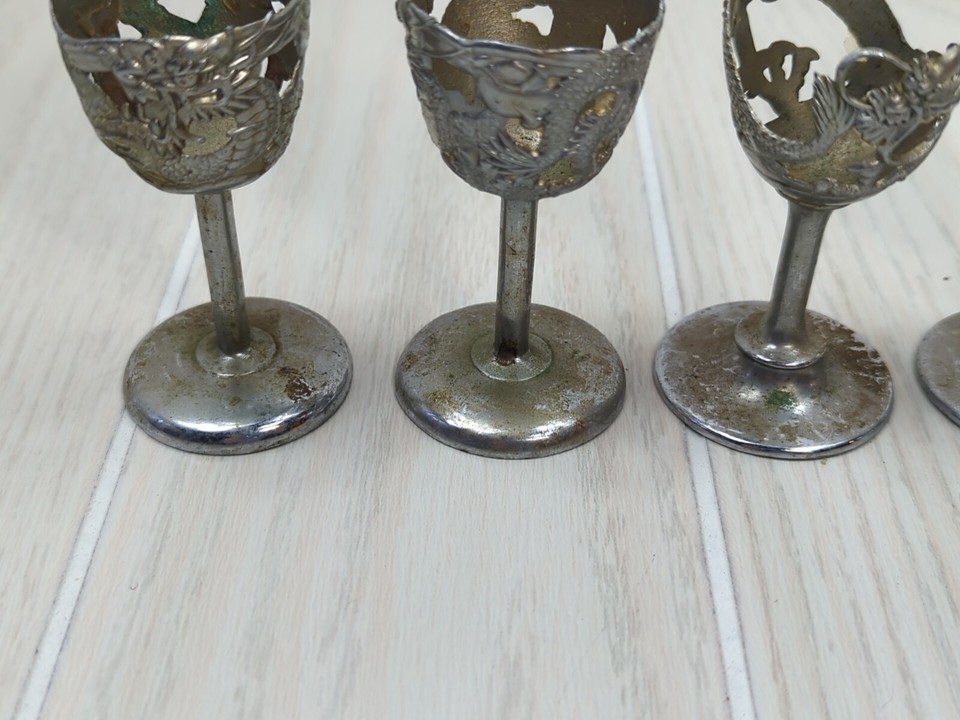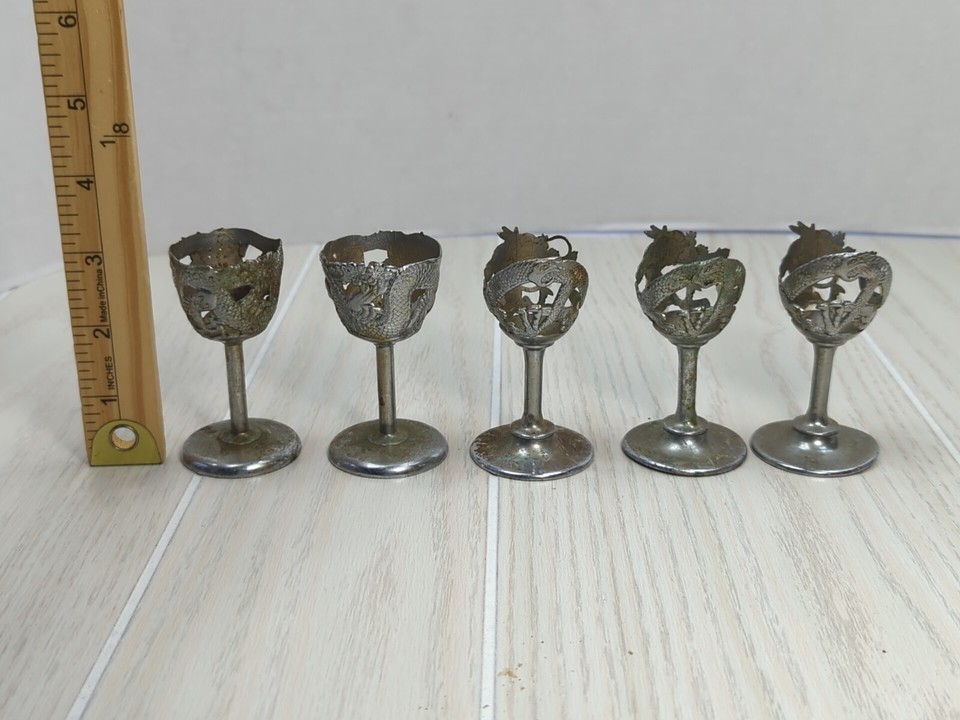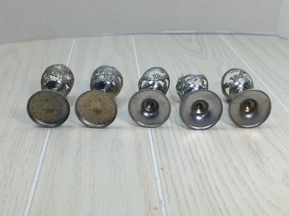 Silver tone Art Deco Dragon Serpent 5 Cordial Glass holders 2 designs