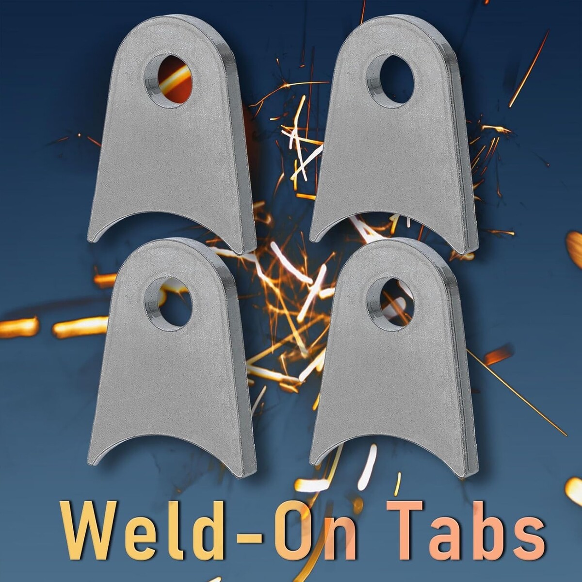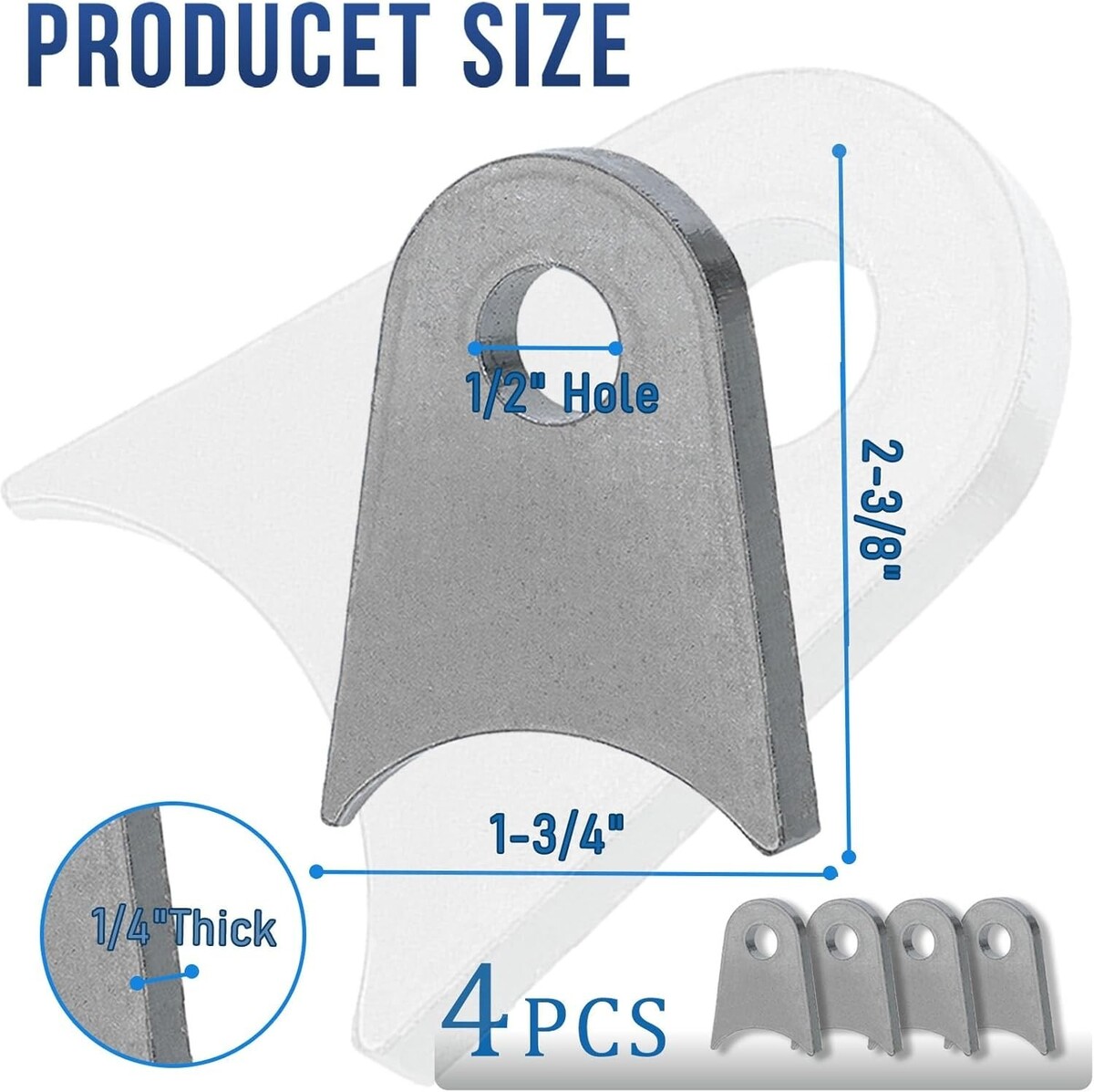 ?Product Dimensions?The Weld on Tabs is 1/2" Hole, 2-3/8" height, 1-3/4" width, and 1/4" thickness for optimal strength and fitment, provide versatile axle mounting solution for various automotive applications