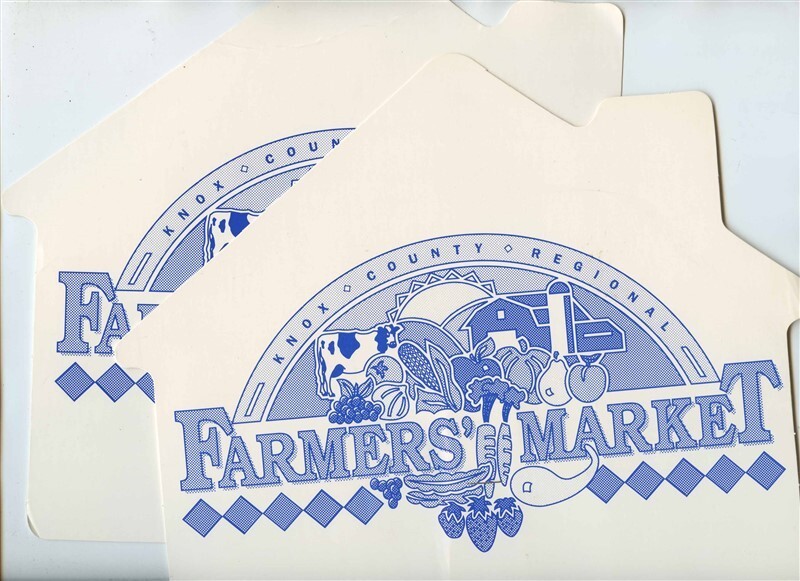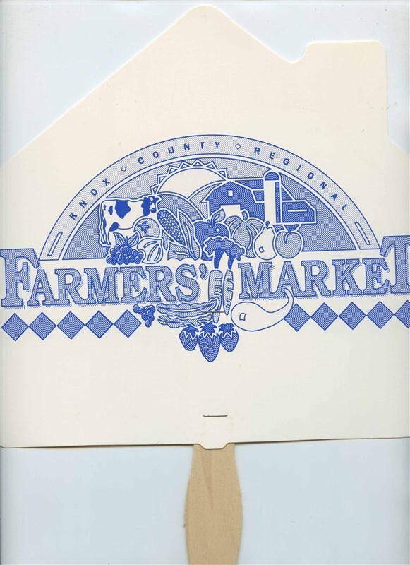 2 identical Knox Regional Farmers Market Hand Fans. From Knoxville Tennessee in the 1990's. With paper handles and blankbacks. The paper portion of the fans measures about 10 1/2" x 9".