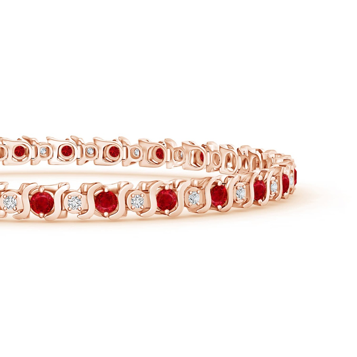 This stunning S link tennis bracelet with catch clasp is crafted exquisitely in 14k solid gold. The alternating red rubies and glimmering diamonds are held together with S-shaped links that add to the design's beauty.