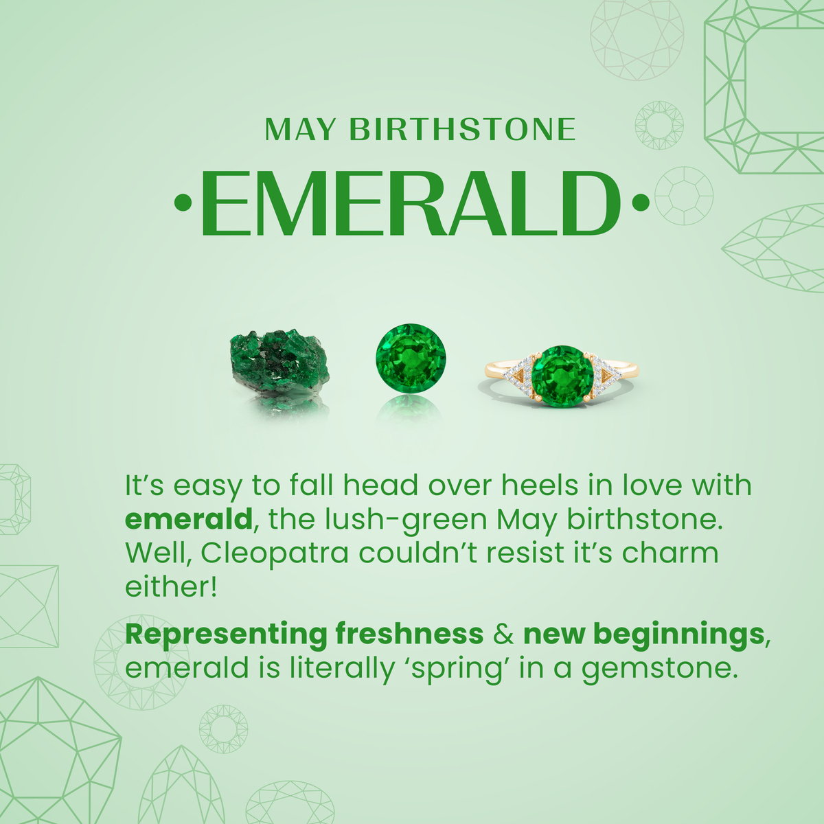 Known for its striking, vibrant green hue, emerald screams glamour and luxury. It represents balance, growth and prosperity, and is the official birthstone for May. Moreover, it also serves as the traditional gemstone for the 20th and 35th wedding anniversaries.