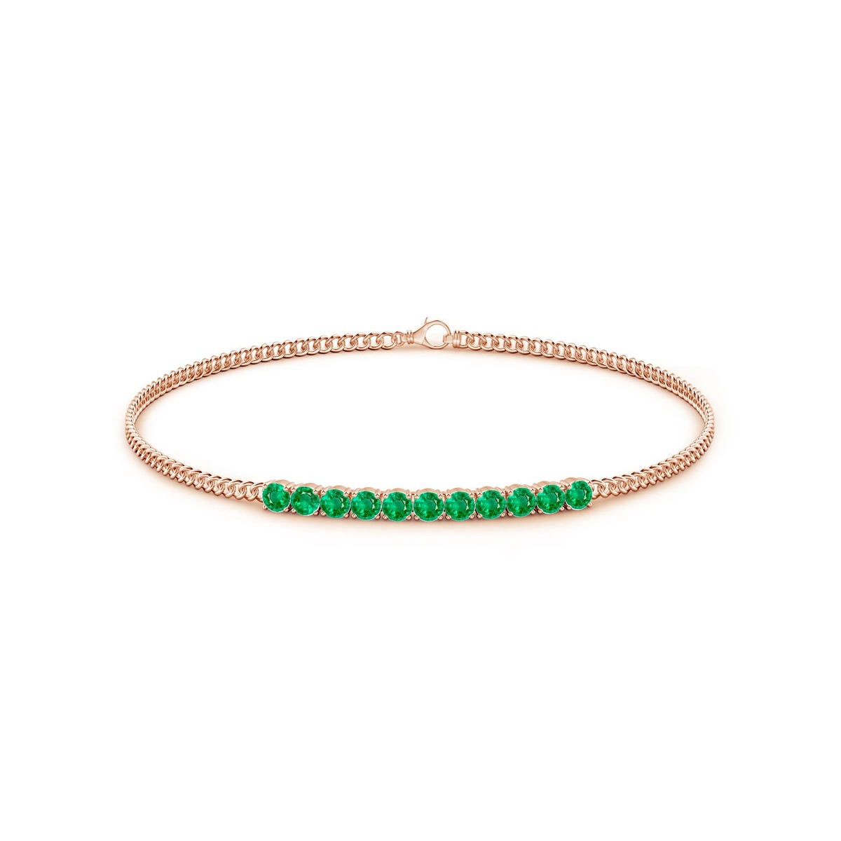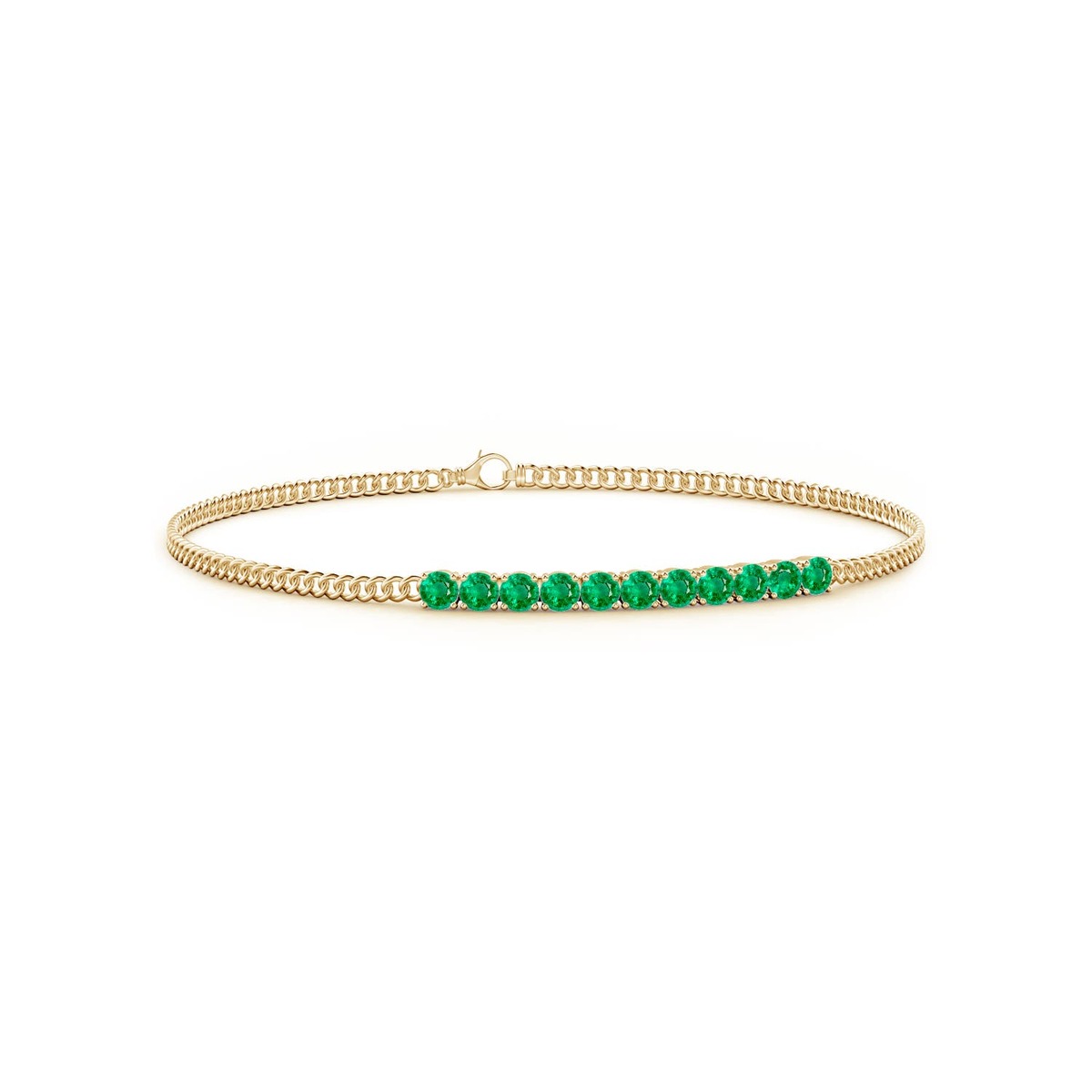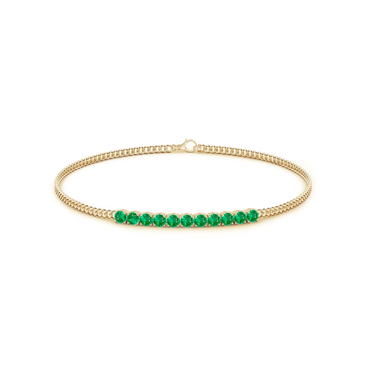A set of linear round emeralds adorns this elegant stackable bar bracelet. The rich green gemstones are prong-set in 14k solid gold.