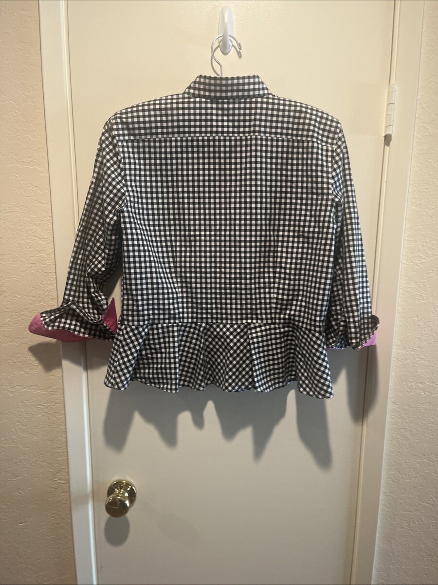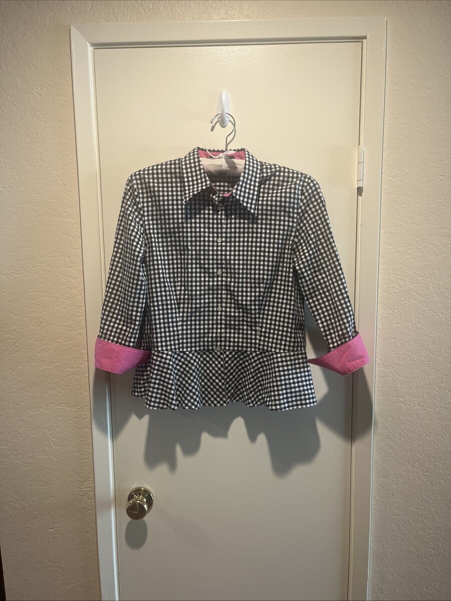 Lauren Ralph Lauren Women’s Sz 8 Black White Gingham Flip Pink Cuff Peplum Shirt