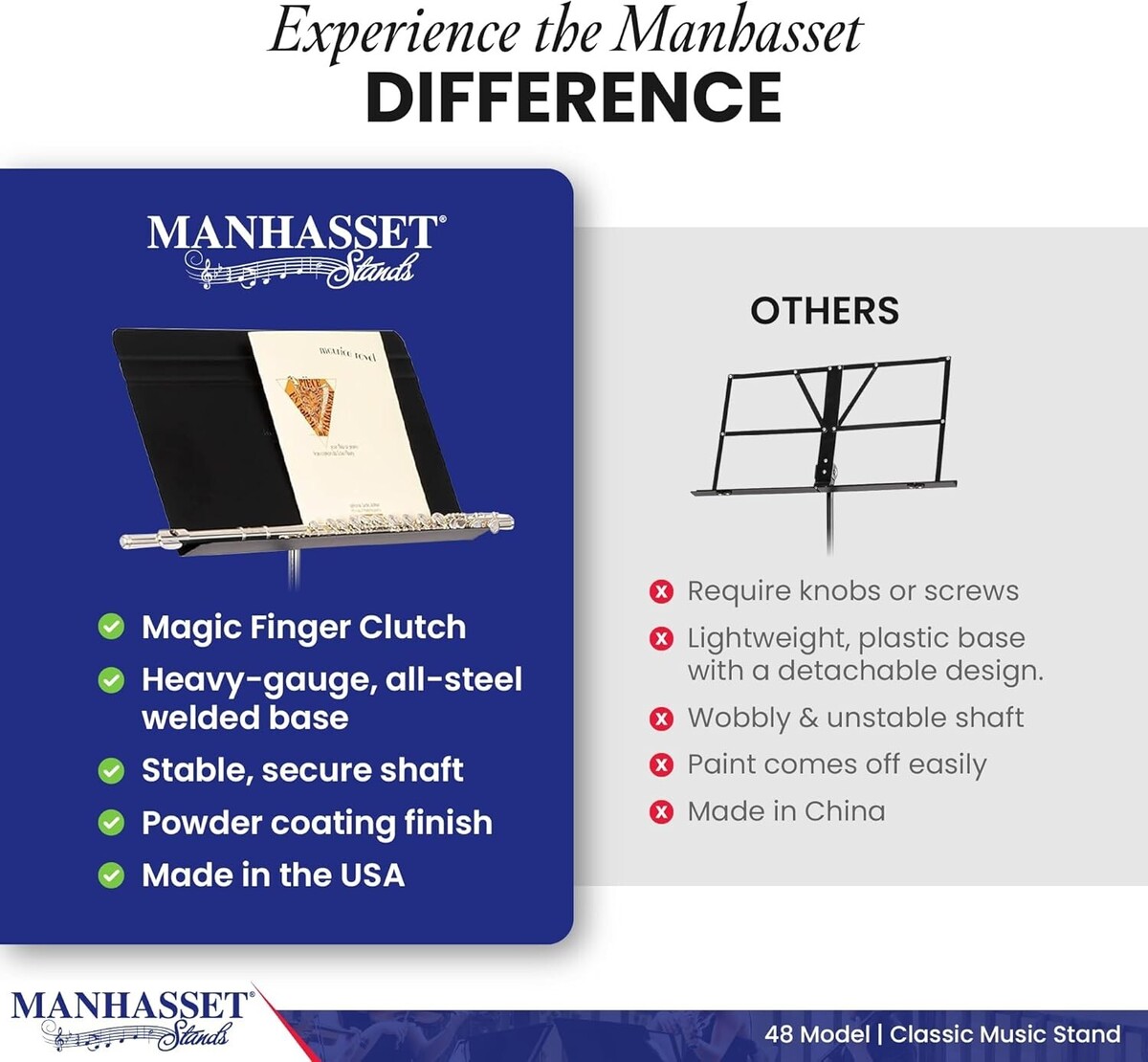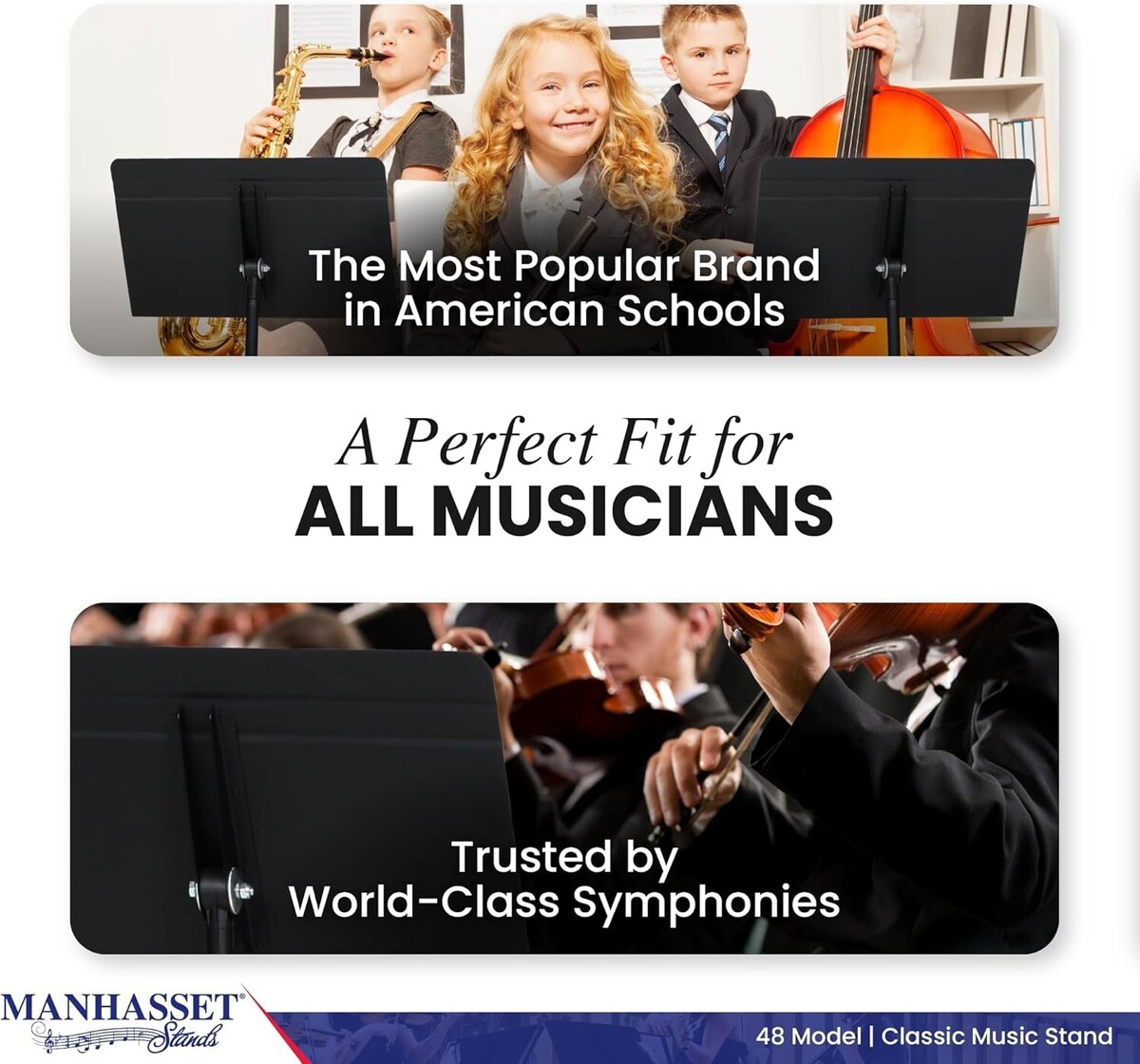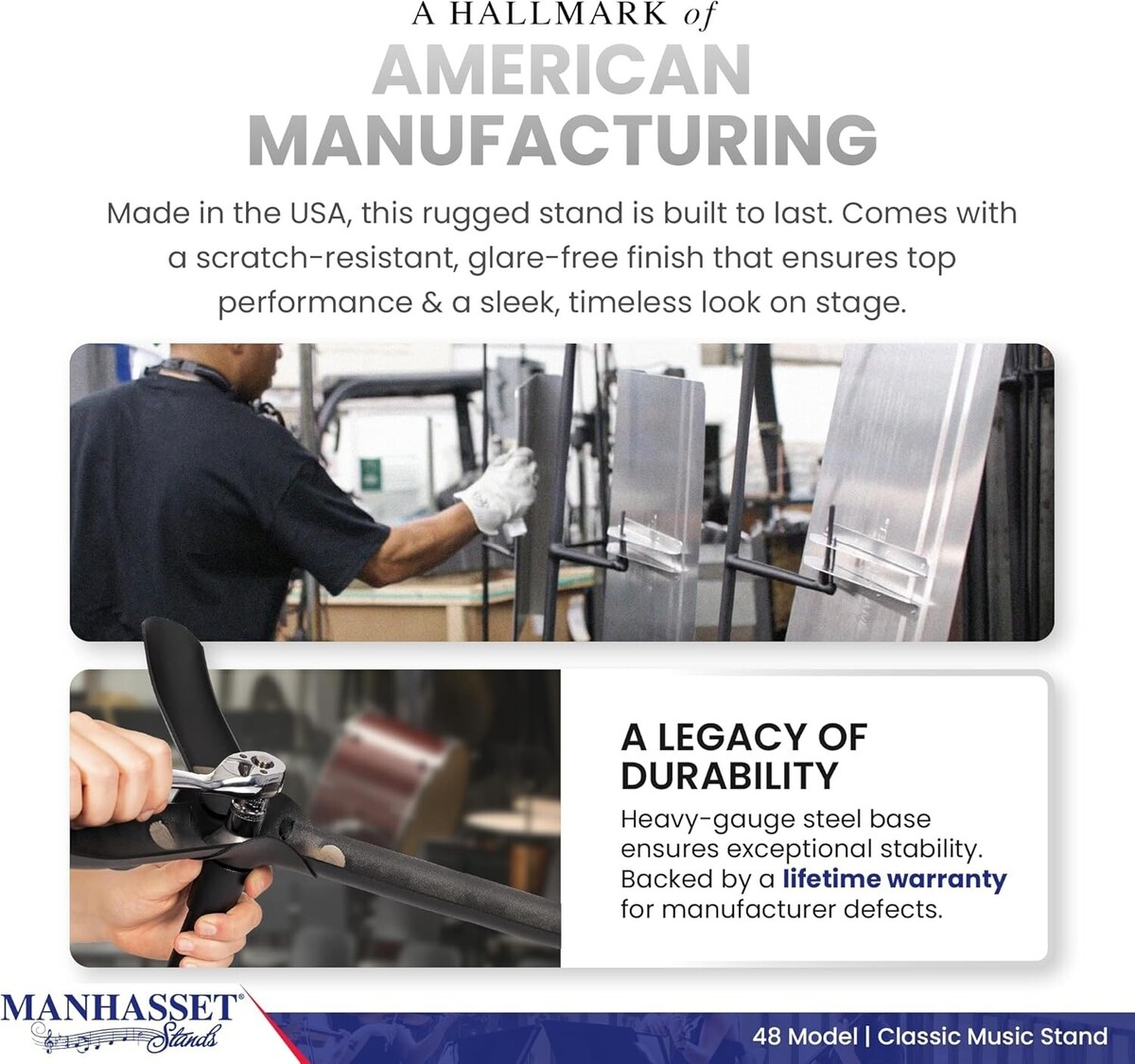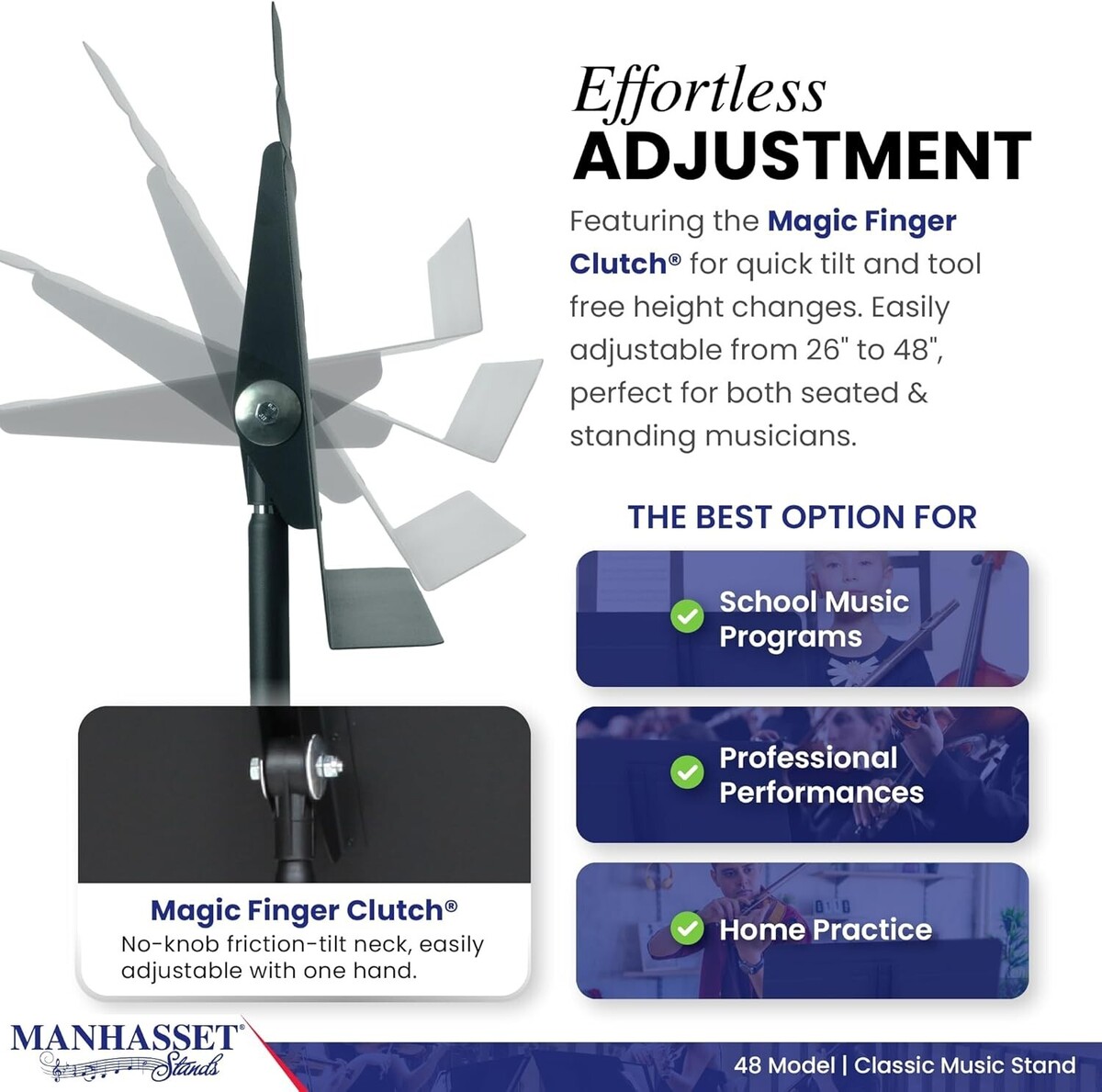M48 Symphony stand perfect for orchestras, school bands, and individual musicians that demand high quality and durability. This is 's most popular music stand. The Symphony stand is used by more schools than all Other music stands combined. This Symphony stand desk measures 20 x 12 1/2. The height of this Music stand varies infinitely from 26" To 48" (Lip to floor), with a maximum overall height of 60 1/2. Features: longest lasting, most durable music stand made. Rugged, all aluminum, lightweight desks are ribbed for extra strength. Baked on, glare free, Black textured finish resists scratches and chipping. Easy, automatic no knob friction tilt neck delivers constant tension at any tilt position. Solid brass bearings, greaseless heavy duty chrome inner shaft, and the original counterbalanced magic finger clutch provides one hand friction grip. Secure at any height, even with a heavy load of music. Heavy gauge, all steel welded base provides excellent stability and requires minimum space on stage risers or in storage. All the components of the music stands are available and can be purchased separately too. This includes all models of desks, shafts, bases, and all pieces of hardware and fasteners.