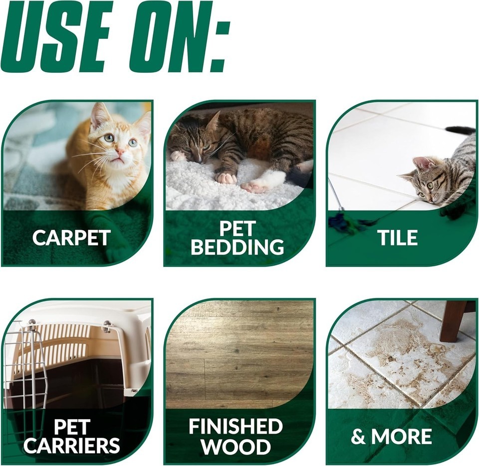 Safe for Surfaces: Carpets, rugs, pet bedding, upholstery, curtains, clothing, litter boxes, crates, carriers, tile, laminate, sealed wood, and concrete