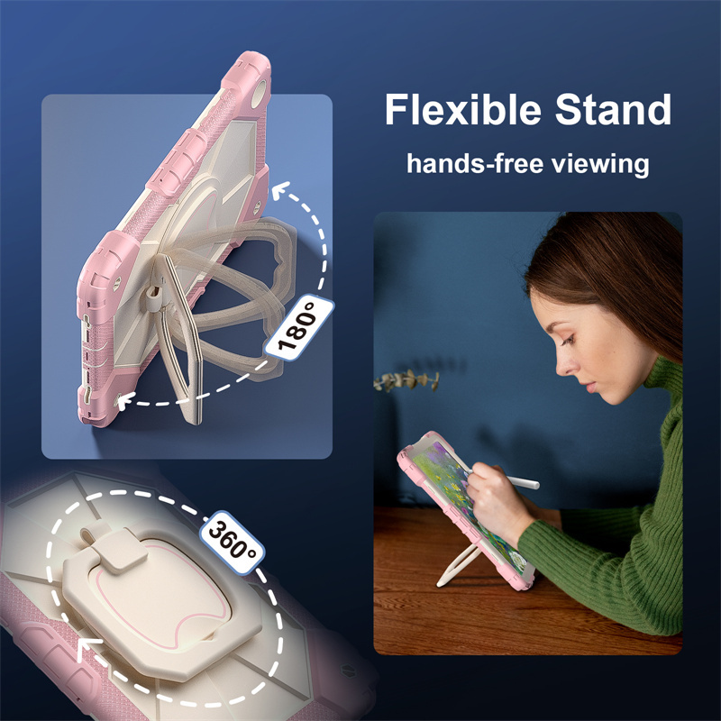 The integrated 360 rotating kickstand allows comfortable viewing in both landscape and portrait modesโperfect for watching videos, browsing, or video calls. A secure hand strap ensures a firm grip, making it ideal for work, travel, school, or outdoor use.