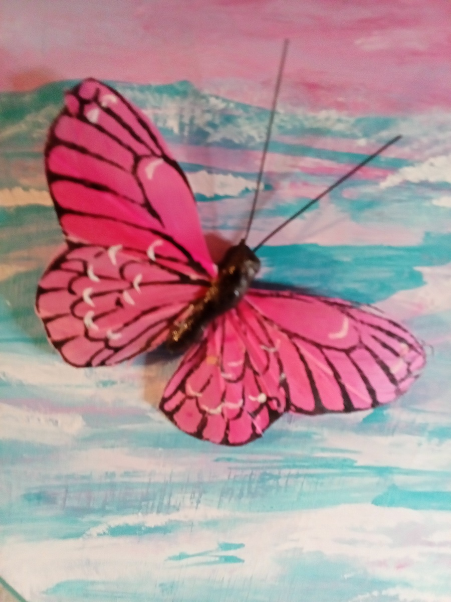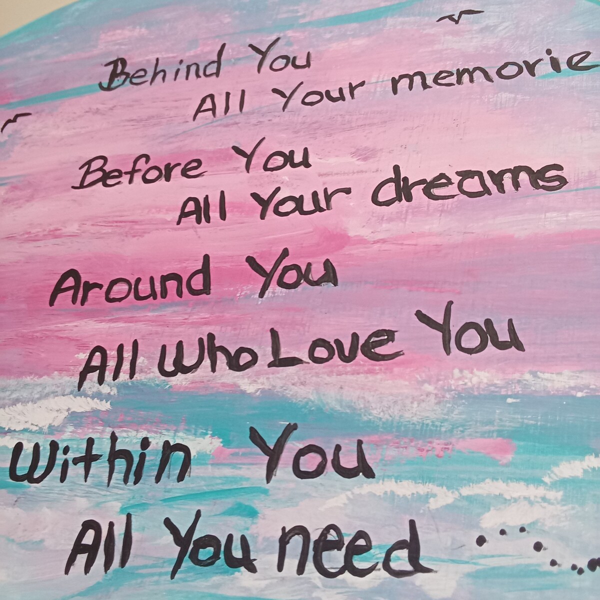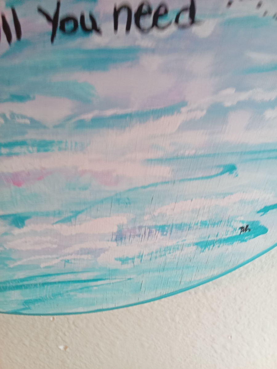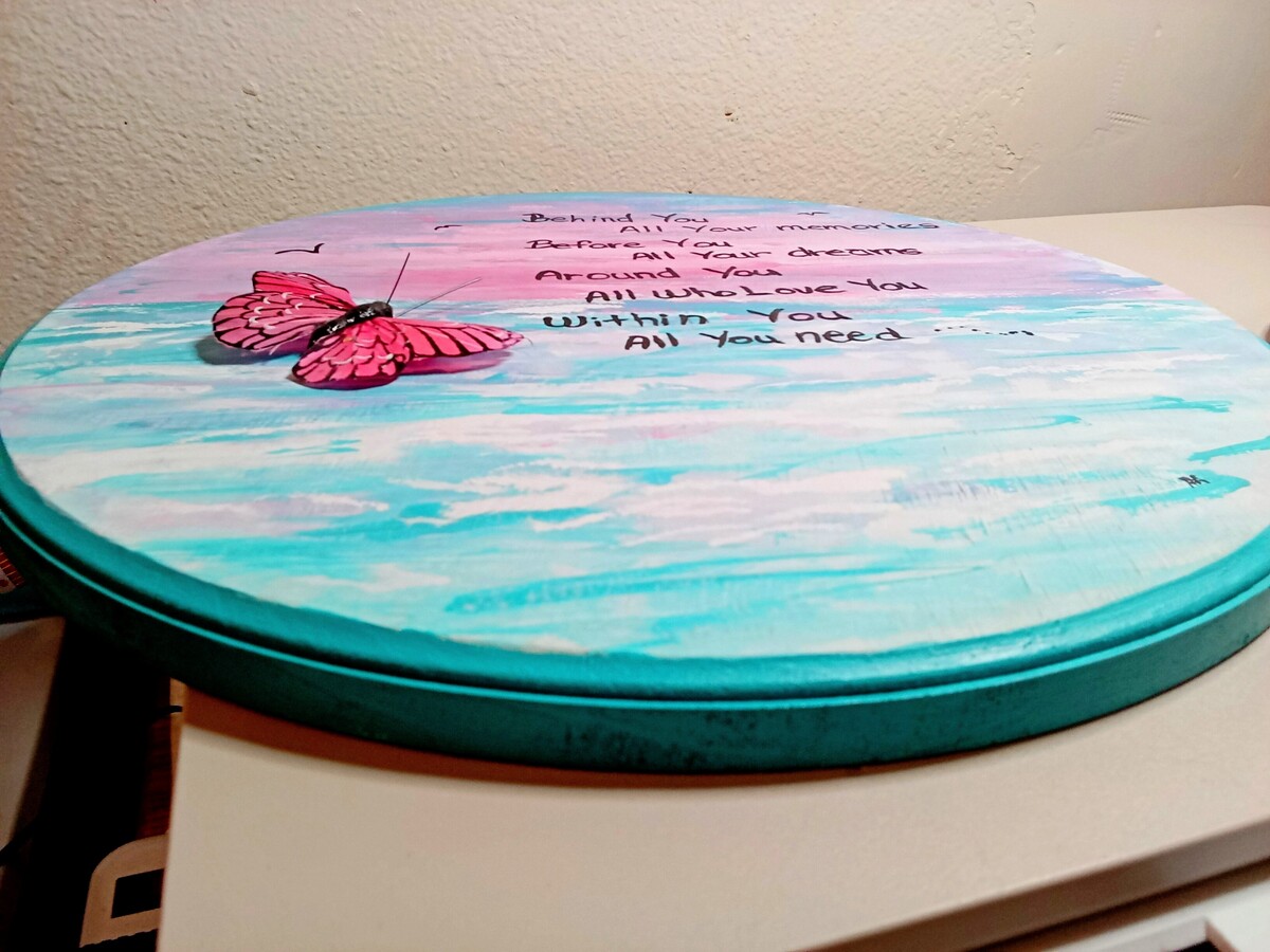 The 12" dia. plaque is 1/2" thick with a hanging hook installed on the back. Painted on the front by a local up coming artist is a ocean view with birds swimming overhead, the quote in black lettering with a beautiful butterfly painted attached next to quote.