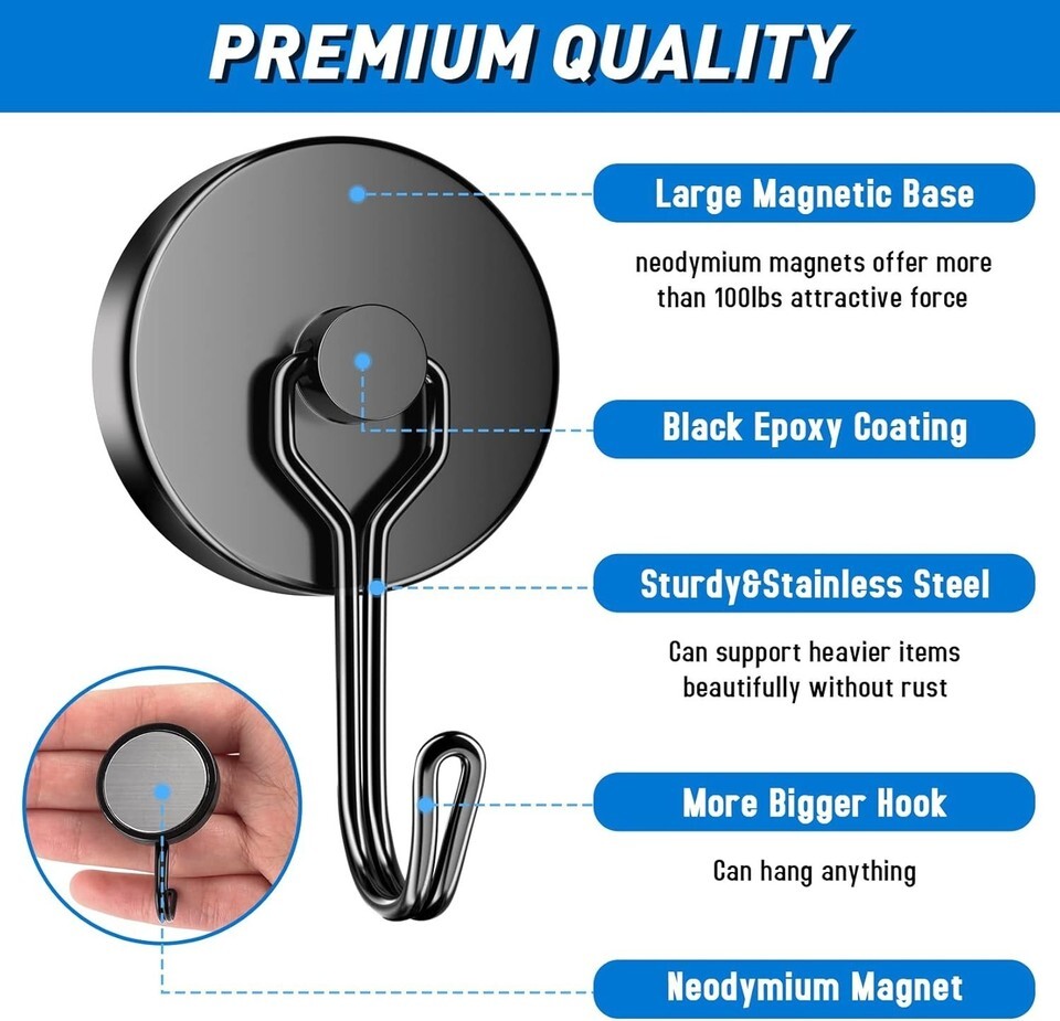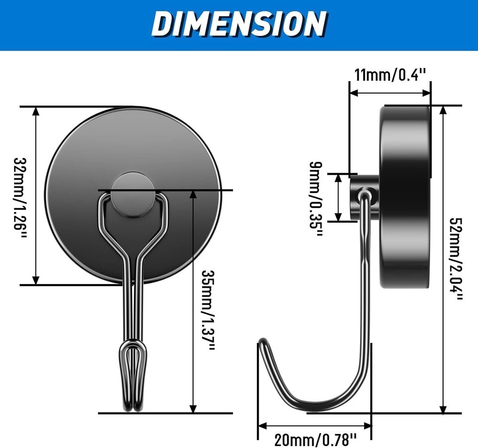 High-Quality Materials - The powerful magnetic force is concentrated only at the bottom of the hooks, while the other three sides are protected by steel cups that have a minimal magnetic force. The magnetic force is equivalent to 10 times the volume of a magnet of the same size.