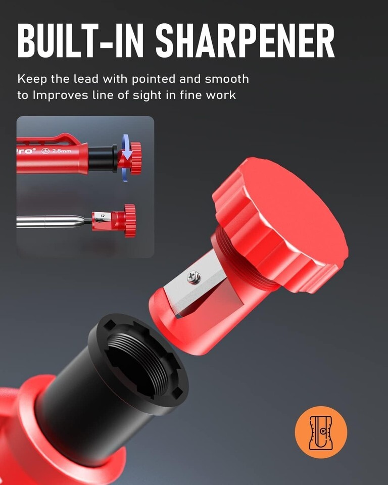 Carpenter Pencils with Sharpener: The sharpener is screwed into the top of the work pencil, which won't get lost either. Built-in pencil sharpener that keep the lead with pointed and smooth to Improves line of sight in fine work