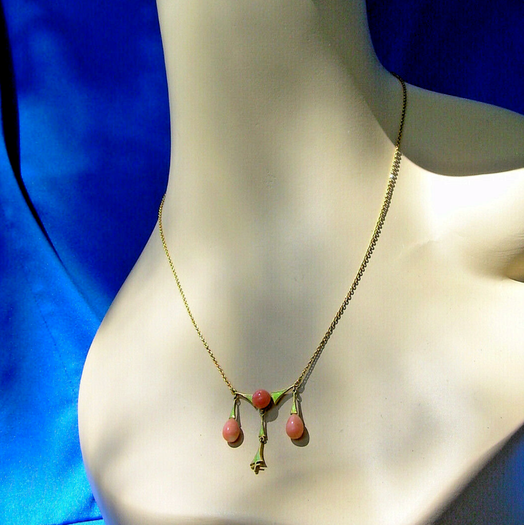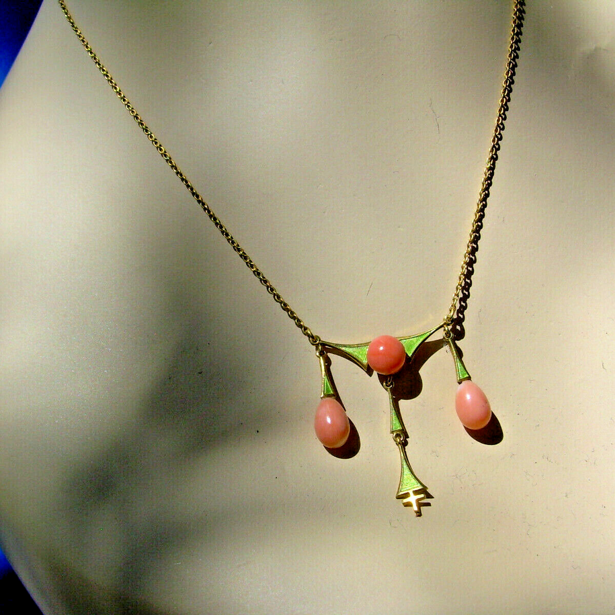 Antique Art Deco Coral Guilloche Enamel Necklace Solid 14K Gold 18" inch Chain