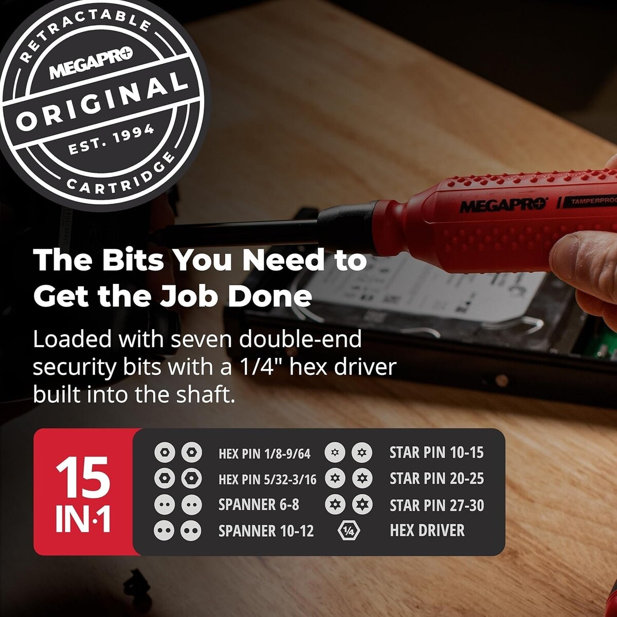 Get the job done with our 15-in-1 Tamperproof Screwdriver. This multi bit screwdriver features an original retractable bit cartridge loaded with 7 double-end security bits for Hex-pin, Spanner, and Torx-pin screws along with a 1/4" Hex driver built into the shaft.