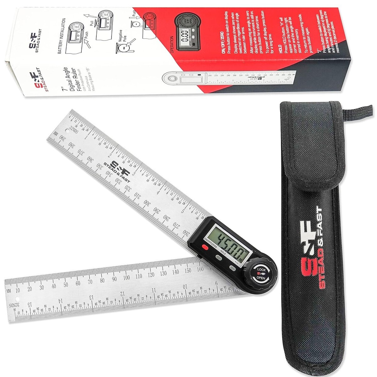 Digital display angle ruler with continuous scale for measuring lengths up to 15 16/32? and 400 mm, folds to ? / 219mm; angles are displayed in and " or degrees to 2 and resolution of