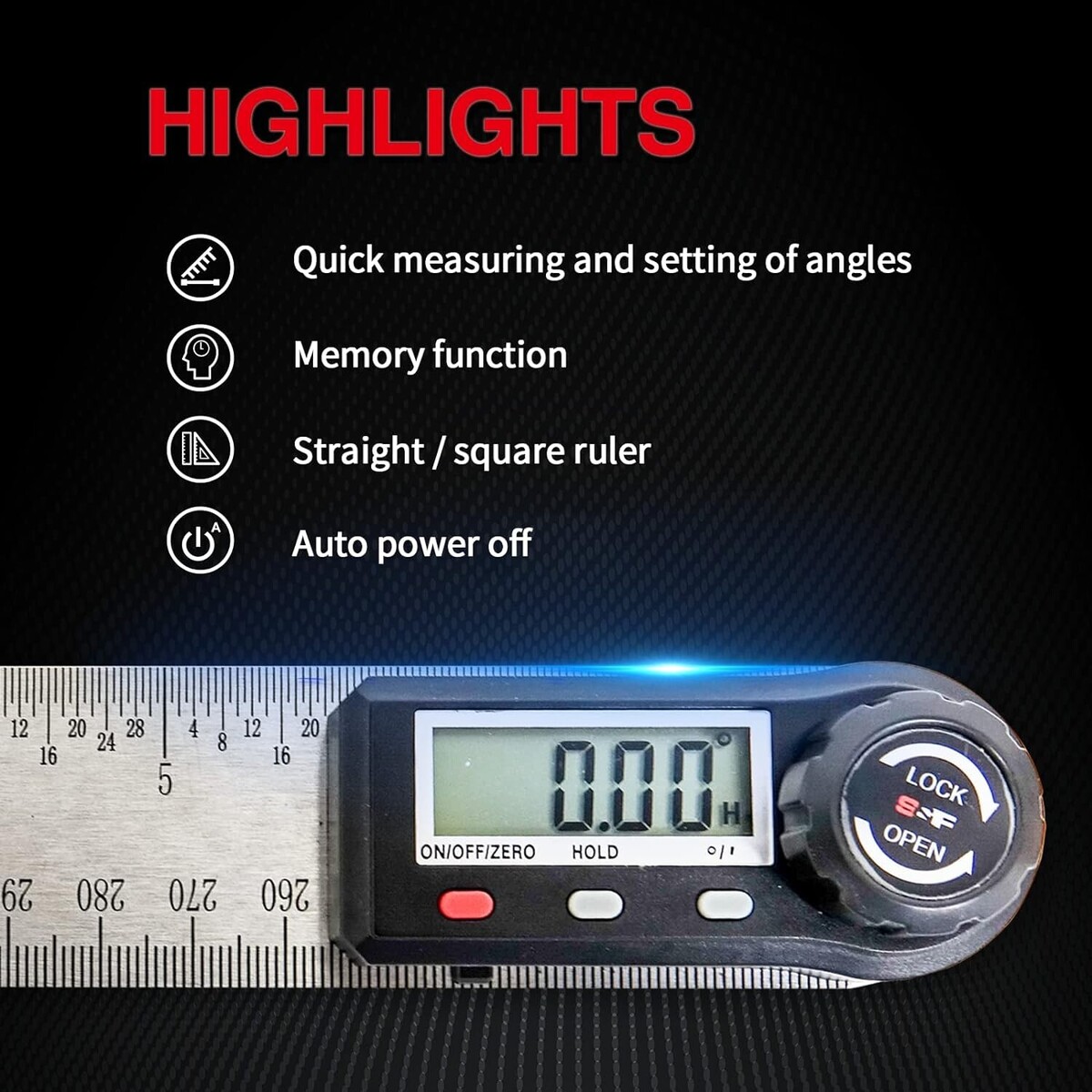 2-in-1 adjustable digital angle finder ruler for measuring lengths and angles, both inside and outside. Folding angle finder tool is made with high quality stainless steel and durable etched scale.