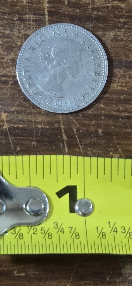 This is a vintage British shilling coin featuring Queen Elizabeth II on the obverse side.