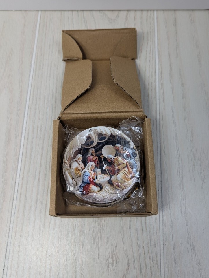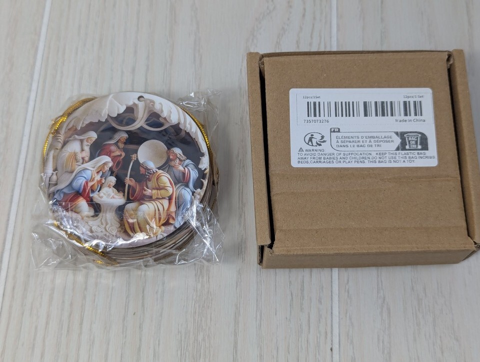 This set includes 12 beautifully crafted round Christmas ornaments featuring various detailed Nativity scenes. Each ornament showcases iconic religious imagery of the birth of Jesus Christ, including Mary, Joseph, the baby Jesus, shepherds, and the Three Wise Men, set against a serene night sky. The designs are rich in color with warm, earthy tones and intricate detailing, highlighting the sacred holiday theme.