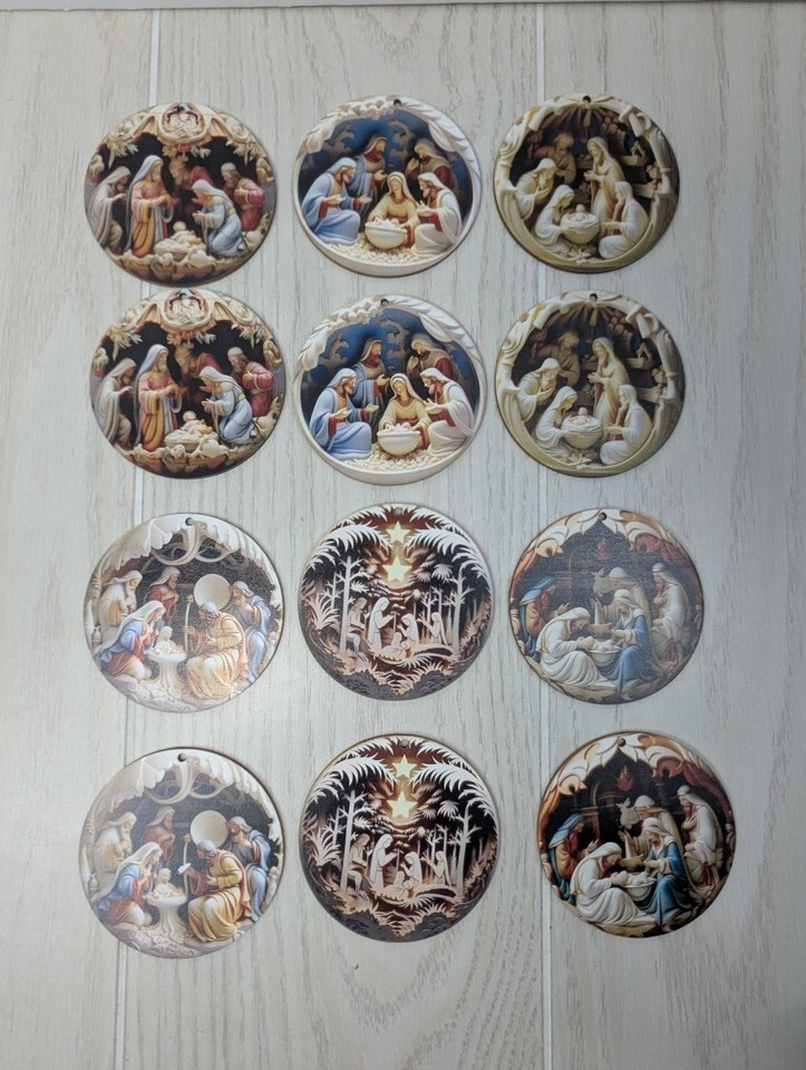 Nativity Scene Round Wooden Christmas Ornaments 12pcs New
