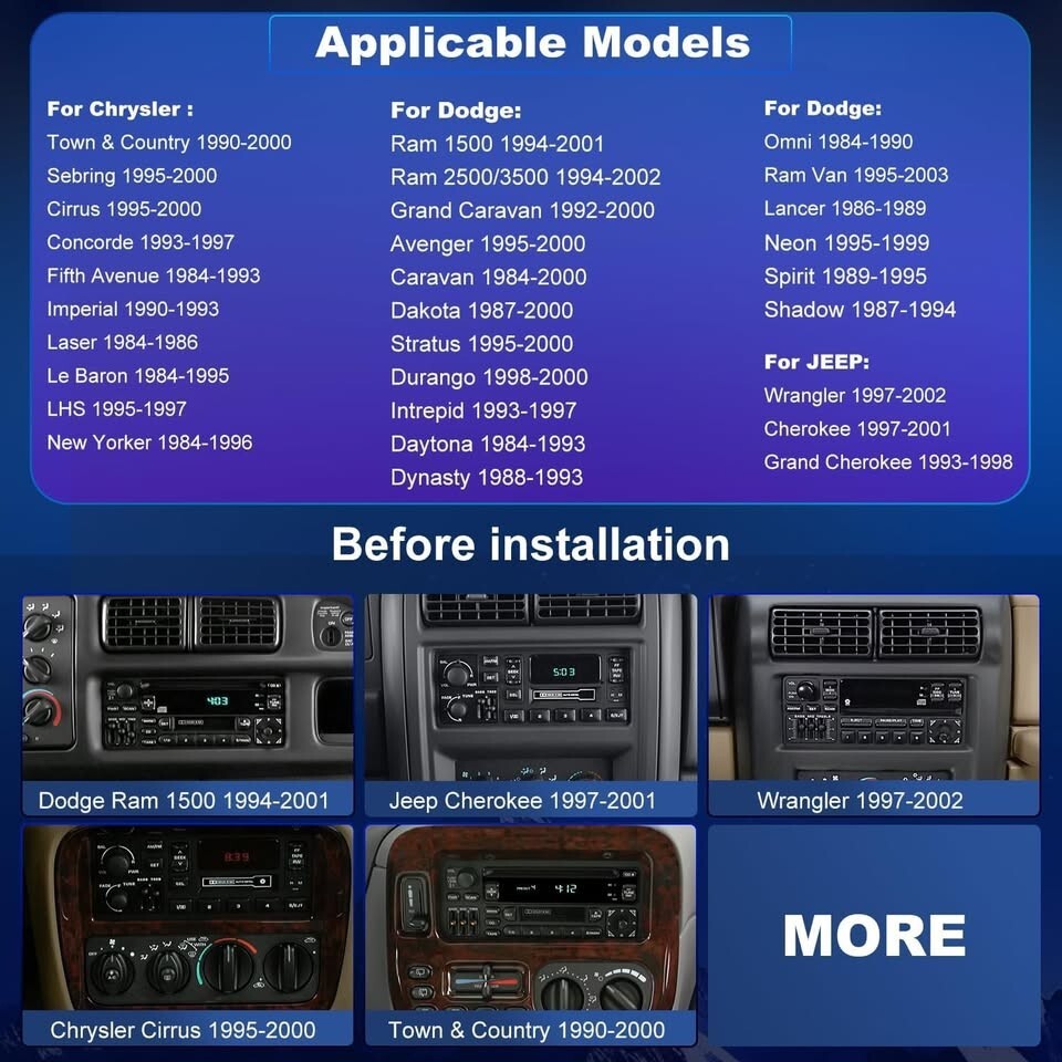 ? Compatibility - Car audio fits Dodge Ram 1500 2500 3500 2006-2008;Avenger 1995-2000;Durango 2004-2009;Caravan 1984-2000;Dakota 1987-2000;Stratus 1995-2000;Durango 1998-2000;Intrepid 1993-1997;Daytona 1984-1993;Dynasty 1988-1993.For Jeep:Wrangler 1997-2002;Cherokee 1997-2001;Grand Cherokee 1993-1998.For Chrysler: Town Country 1990-2000;Sebring Cirrus 1995-2000;Concorde 1993-1997;Fifth Avenue 1984-1993;Imperial 1990-1993;Laser 1984-1986;Le Baron 1984-1995;Lhs 1995-1997