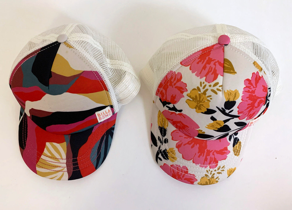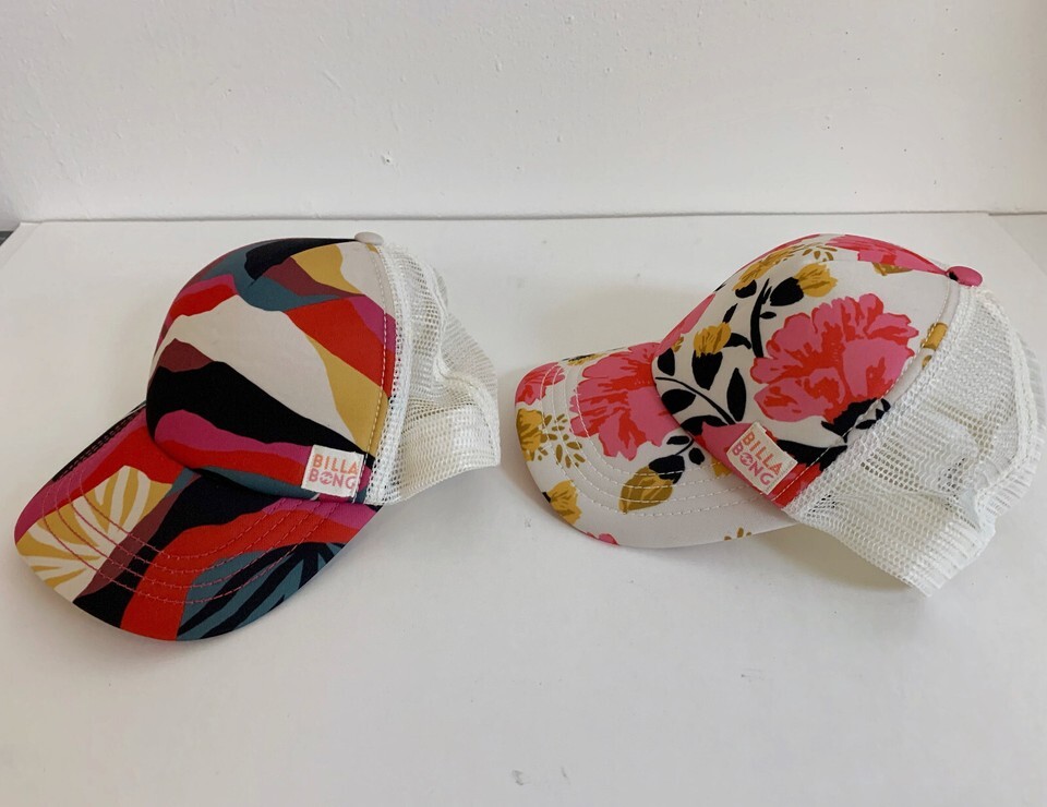 One Pink White Floral snapback and one Abstract Geometric snapback Trucker Hat - both are lightly used but still in really good condition. Ready for summer beach wear!