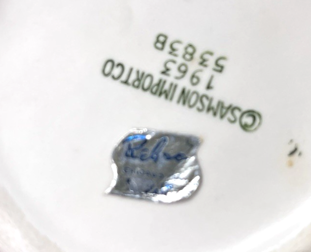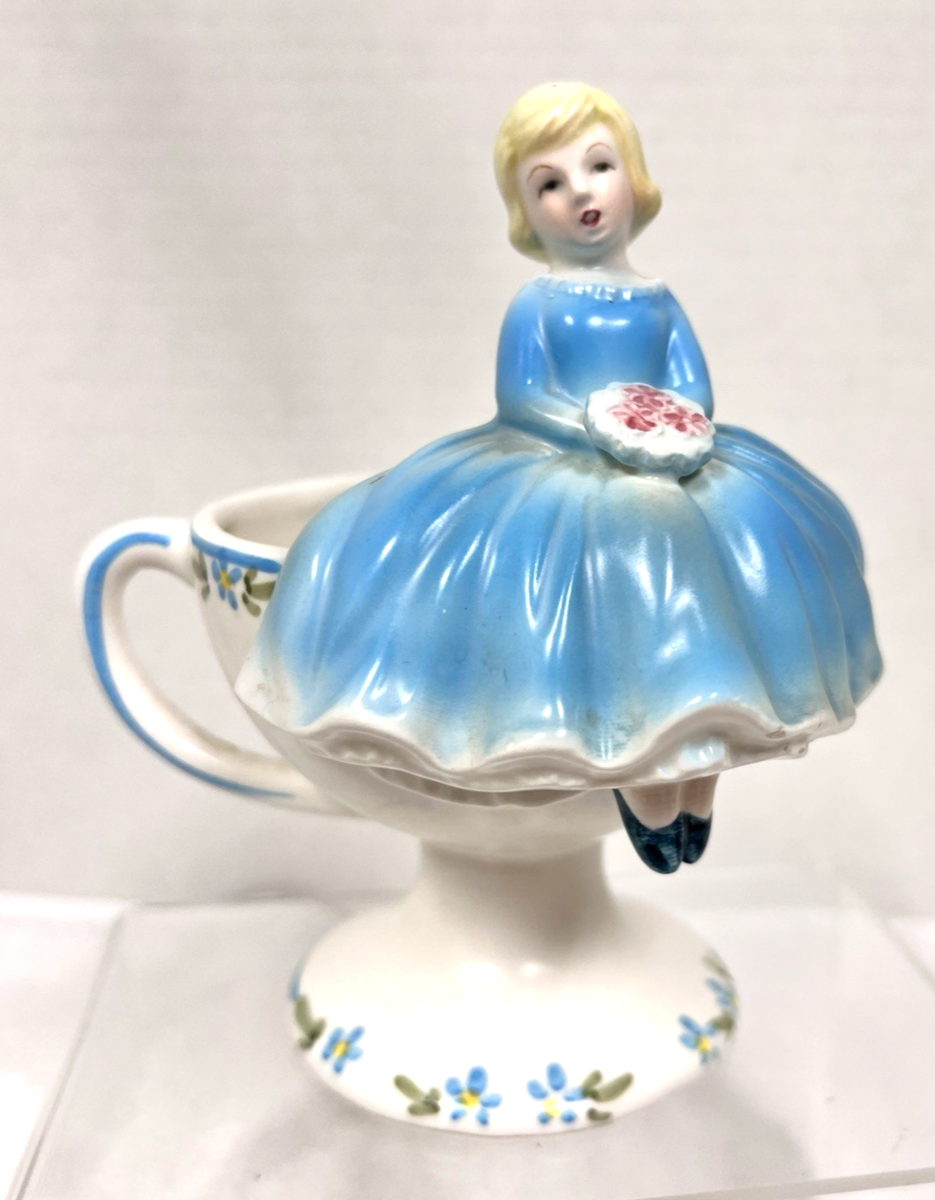1963 Relpo Samson Import Girl Sitting On Teacup Ceramic Flowerpot Planter Vase In great shape the foil Relpo sticker has wear but can be read. It stands just shy of 6 inches tall the base is about 3 1/8 inches and the cup 4 5/8 inches across