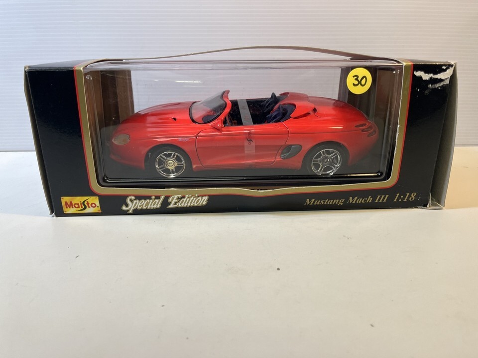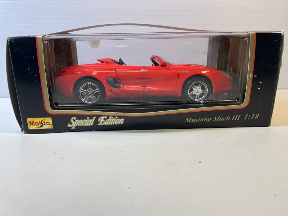 Ford Mustang Mach III Concept Car in 1/18 Scale Diecast by Maisto. This Diecast car checks all the boxes for a reasonably priced rendition of the classic die cast Ford Mustang Mach III Concept Car. This die cast car will be packaged with care and shipped expeditiously. This is a used car and may have paint imperfections and / or other defects but is priced accordingly. Please review pictures carefully before purchasing.