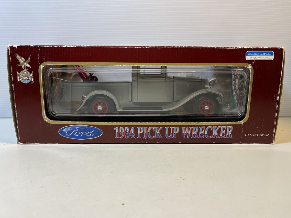 1934 Ford Pick Up Wrecker Diecast Model Car: 1/18 Scale By Road Legends. This Diecast car checks all the boxes for a reasonably priced rendition of the classic die cast 1934 Ford Pick Up Wrecker. This is a used car and may have paint imperfections and / or other defects but is priced accordingly. Please review pictures carefully before purchasing.