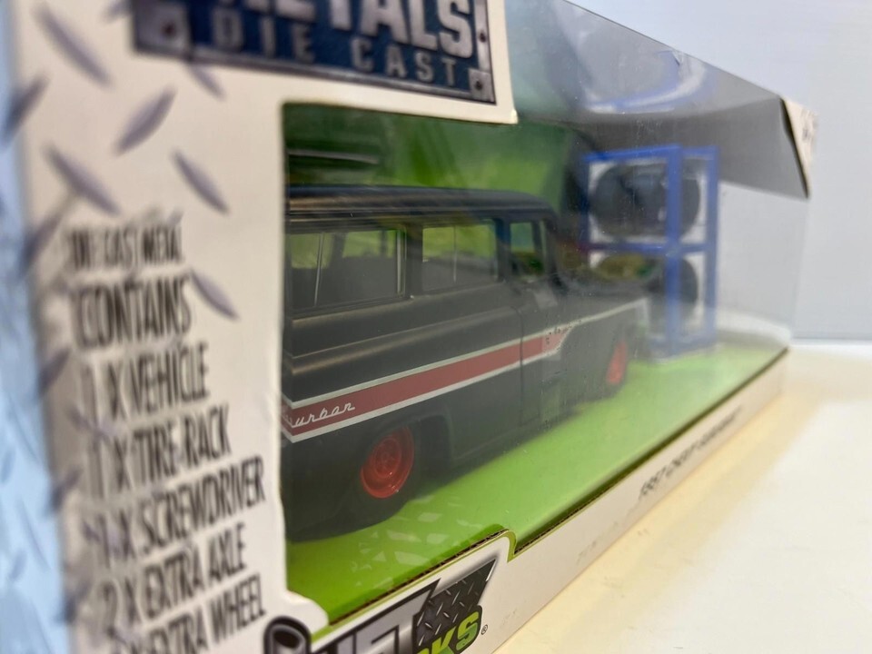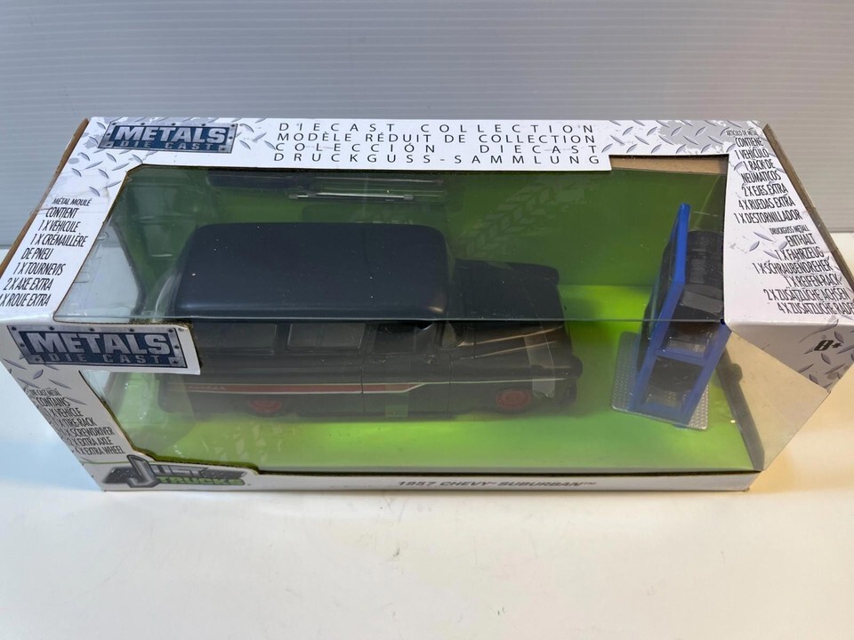 1957 Chevy Suburban w/ Tire Rack New In The Box in 1/24 Scale Diecast by Jada. This Diecast car checks all the boxes for a reasonably priced rendition of the classic die cast 1957 Chevy Suburban w/ Tire Rack.