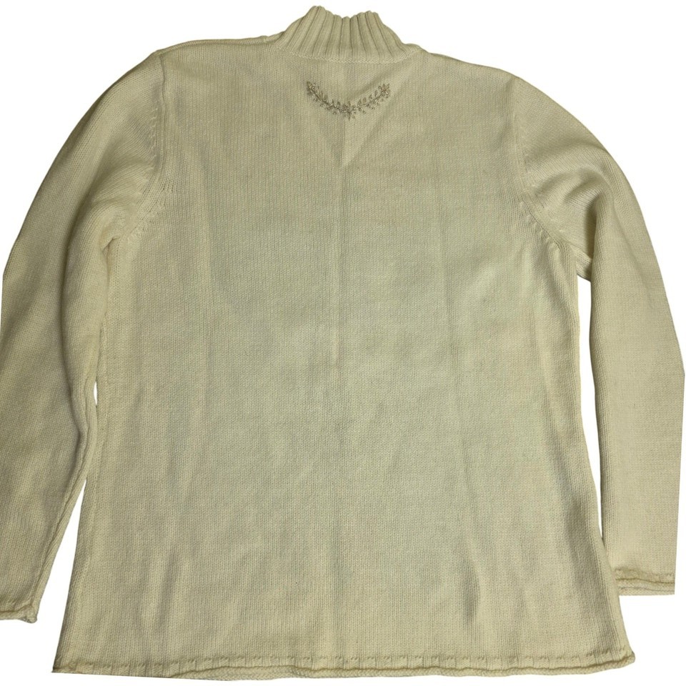 Coldwater Creek cream sweater featuring intricate embroidered doves and floral folklore motifs with a soft mock neck. The cotton-nylon blend with rabbit hair adds a plush, elevated feel without being heavy. Feminine and romantic, perfect for winter styling, holiday gatherings, cottagecore looks, and soft, whimsical wardrobes.