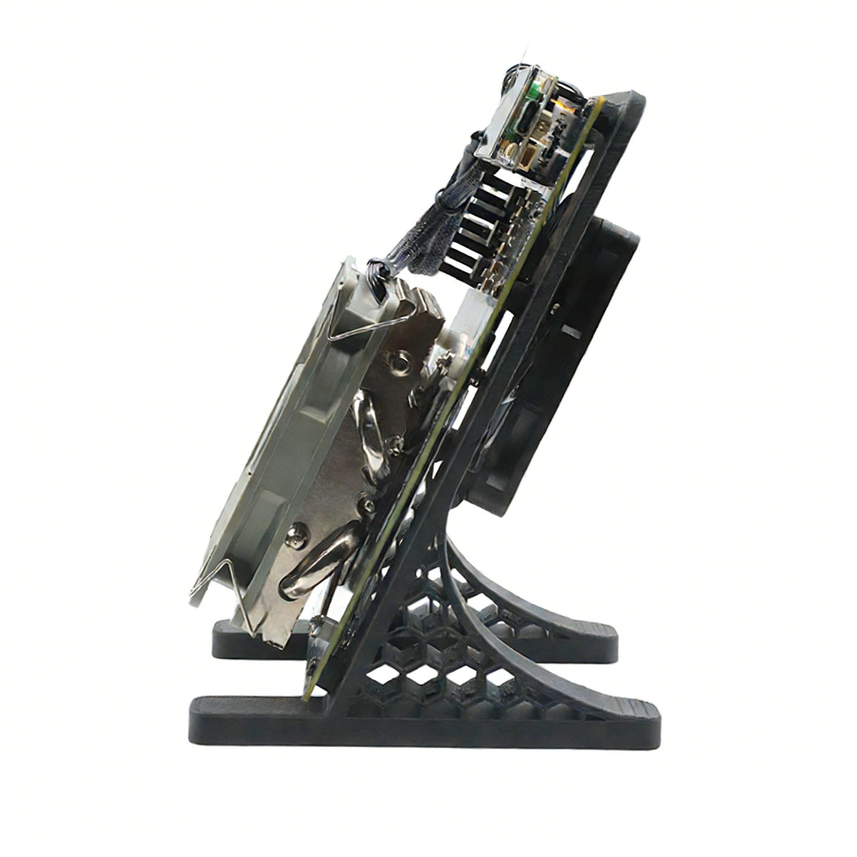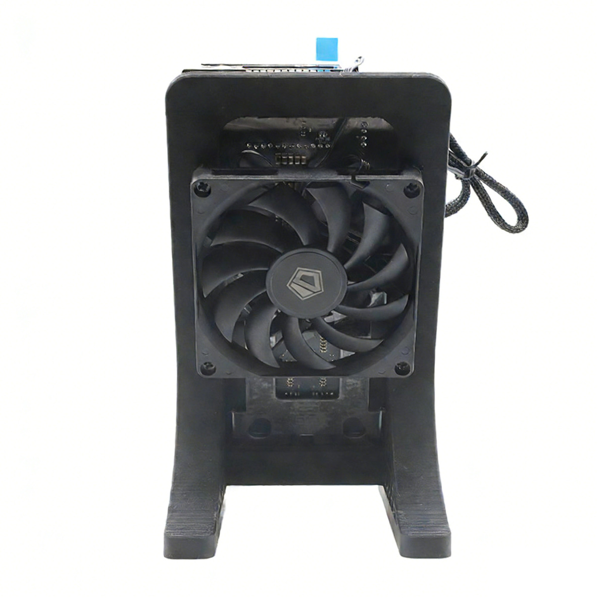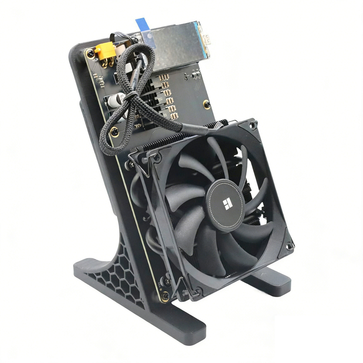 Dual fans keep noise 28dB, ASIC/VRM temps stabilized at 57.2C/54.4C; 3D-printed stand, wireless WiFi, no extra cooling—perfect for residential use.