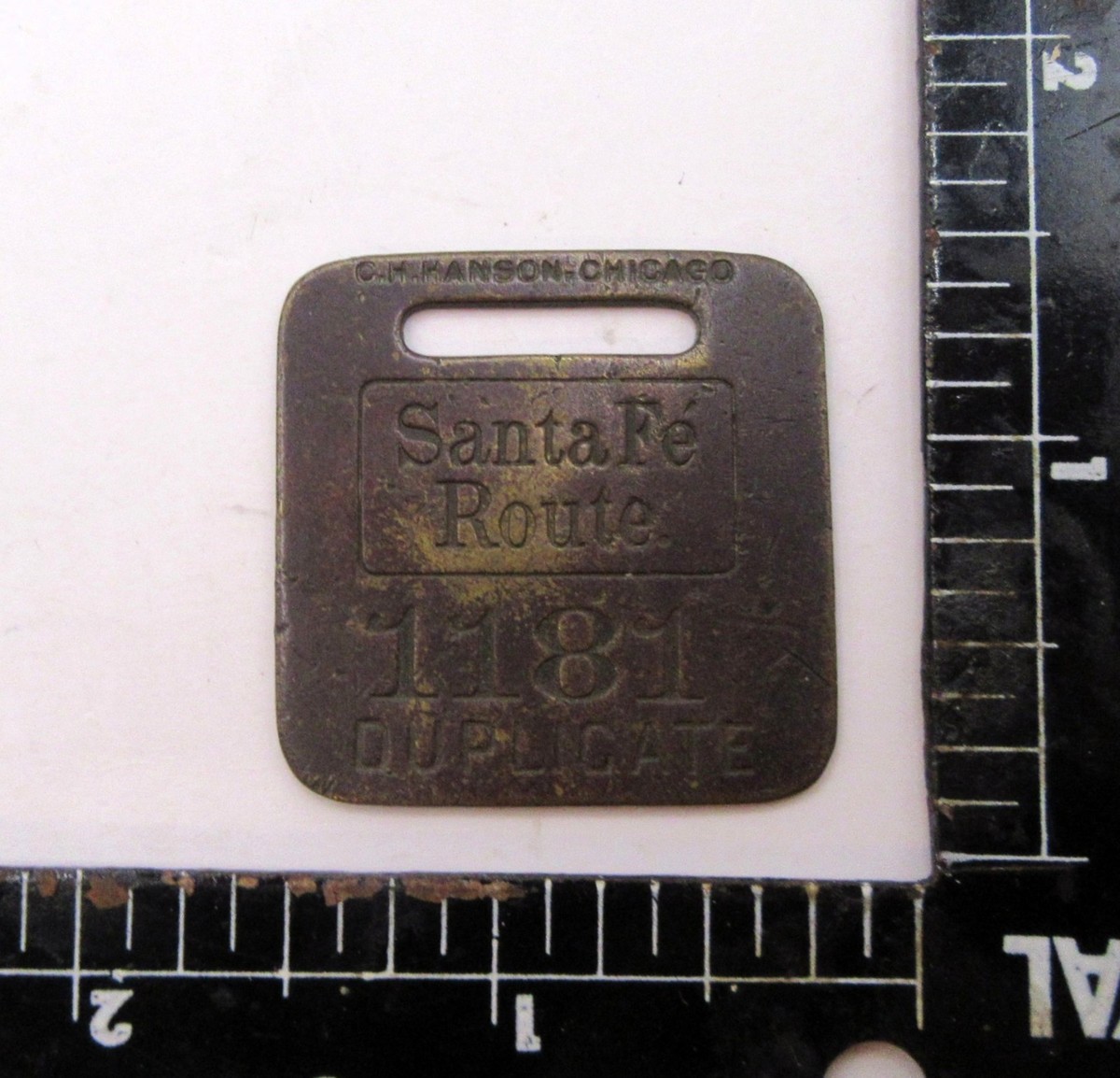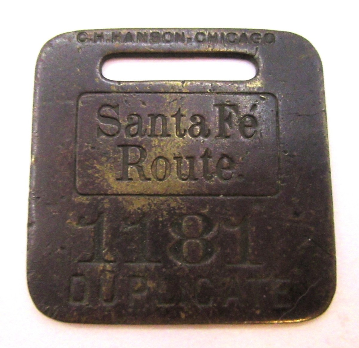 2.Rare Santa Fe Route brass baggage tag by C.H. Hanson in Chicago. The tag is marked "Santa Fe Route", "1181", and "DUPLICATE". It also includes manufacturer's mark "C.H. Hanson Chicago". Railroads used durable brass tags to manage passenger luggage. One tag was attached to the bag, and a duplicate (like this one) was given to the owner to reclaim luggage. The tag is a sought-after item for enthusiasts of vintage railroad memorabilia.