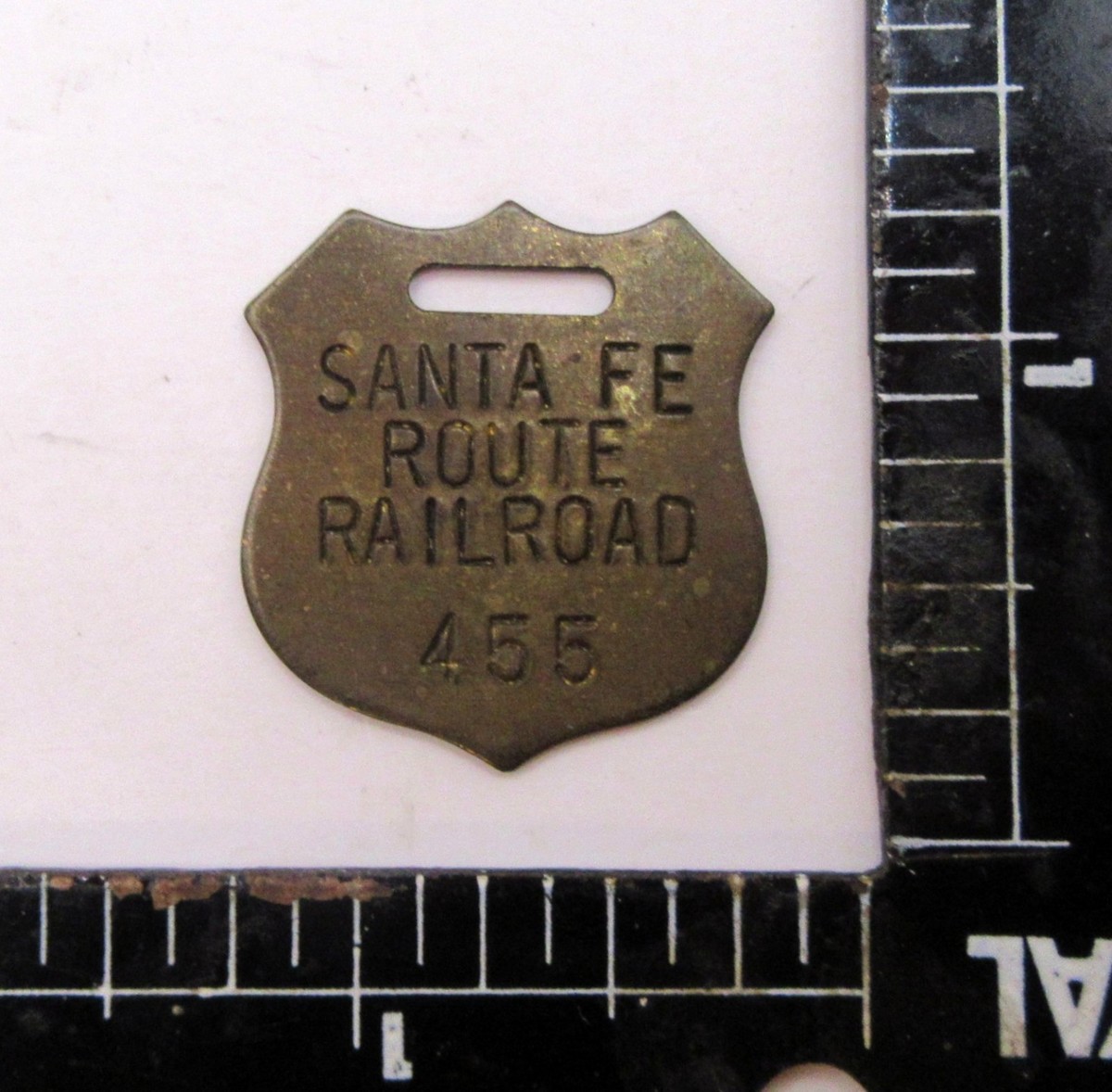 3.Santa Fe Route Railroad baggage tag or fob. This tag is made of brass and features the number "455" stamped on it. The Atchison, Topeka and Santa Fe Railway (AT SF) was instrumental in connecting the American heartland to the Pacific coast. The Santa Fe railroad merged into the Burlington Northern Santa Fe Railroad in 1995.