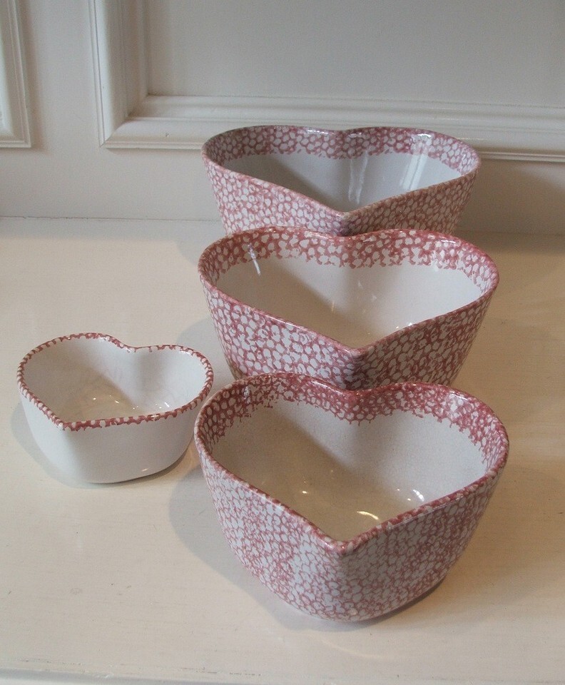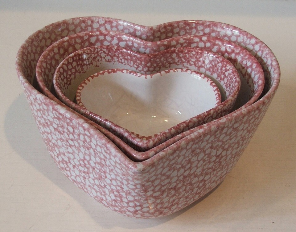 Set of 4 Heart Shaped Nesting Serving Bowls Speckled Rose Pink Pattern Stoneware