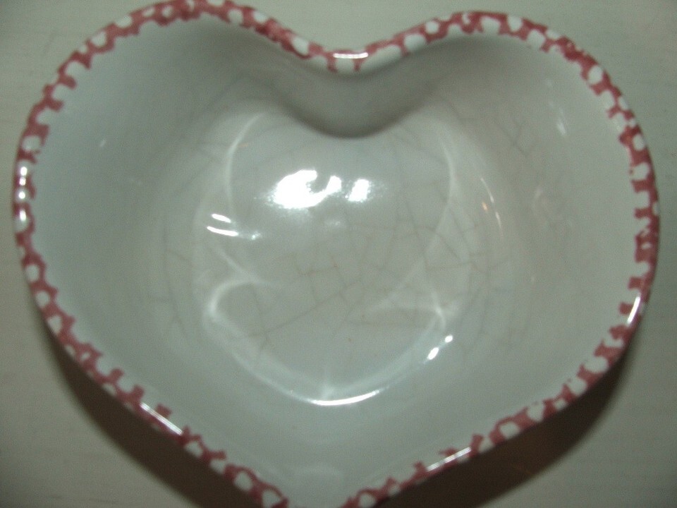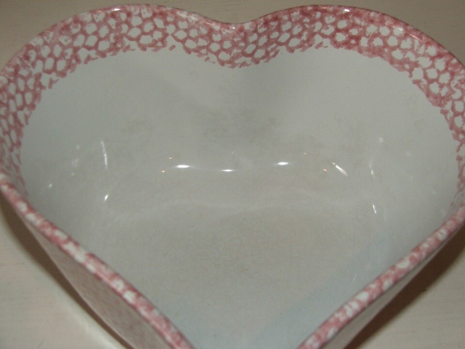 Set of 4 Heart Shaped Nesting Serving Bowls Speckled Rose Pink Pattern Stoneware. All bowls show crazing and utensil marks. The largest bowl shows the least amount. No chips or cracks. Smoke free home.