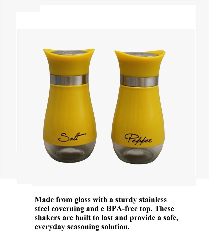This salt and pepper shaker set is designed for everyday kitchen and dining use. The set features BPA-free glass shakers with stainless steel tops and clearly printed ?Salt? and ?Pepper? labels for quick identification during cooking or table service.