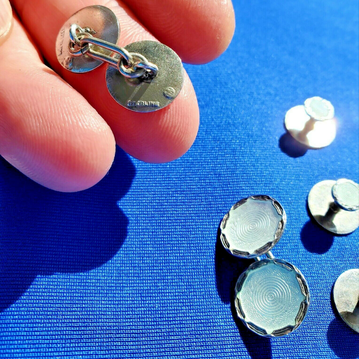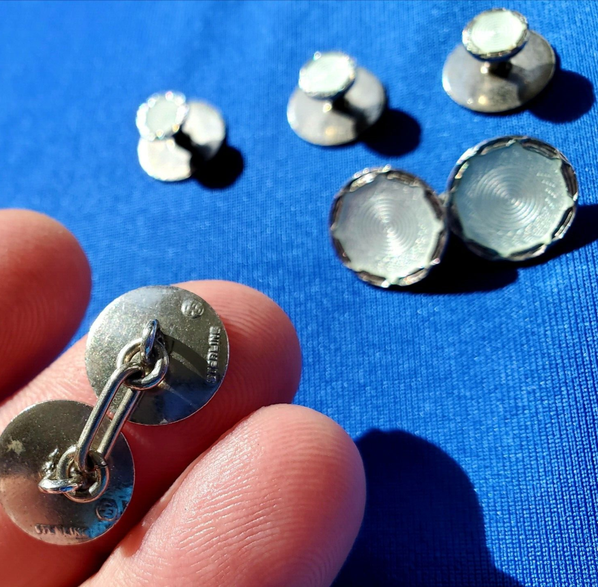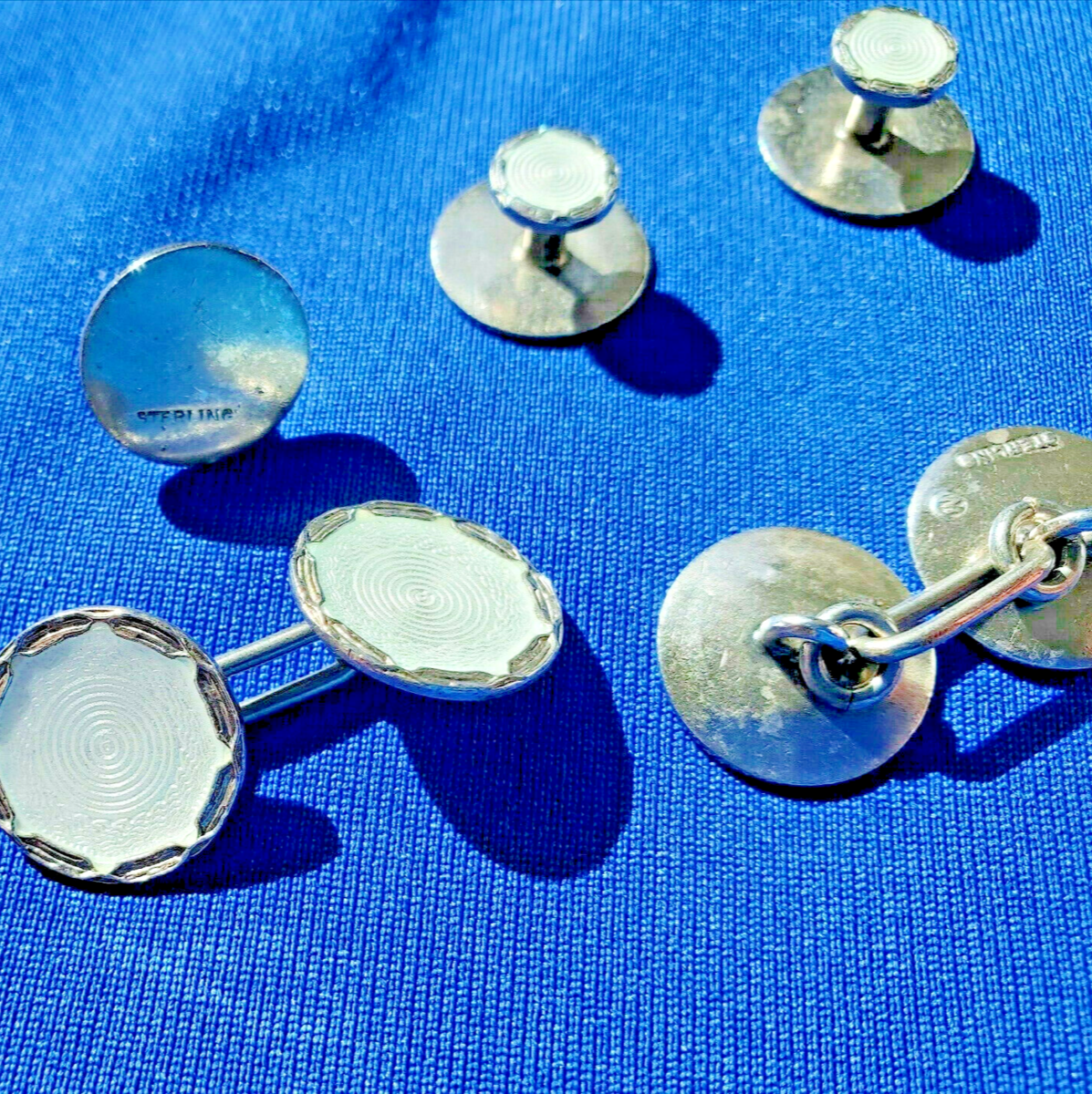 Art DECO STERLING SILVER GUILLOCHE ENAMEL CUFFLINK BUTTONS SET ANTIQUE