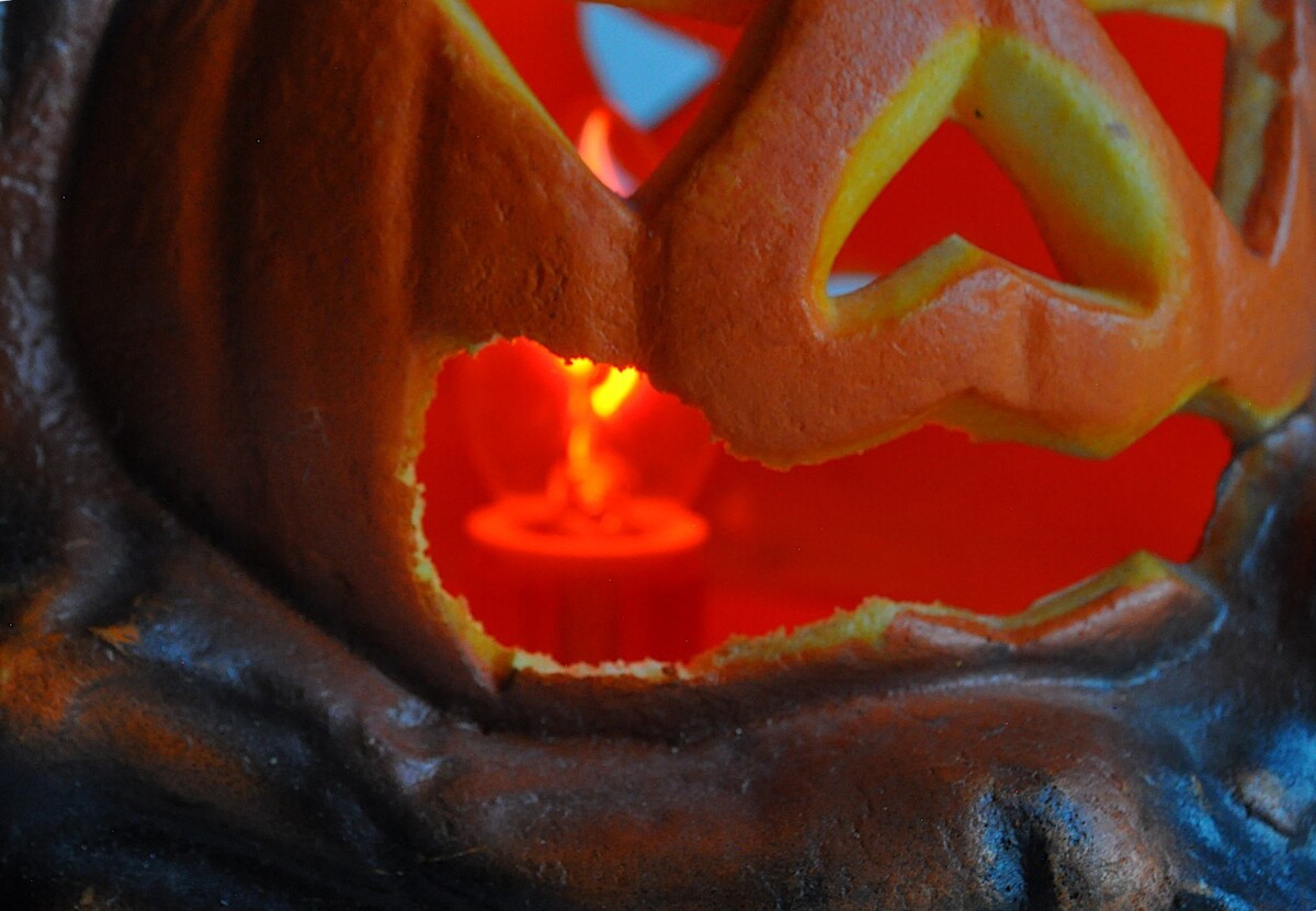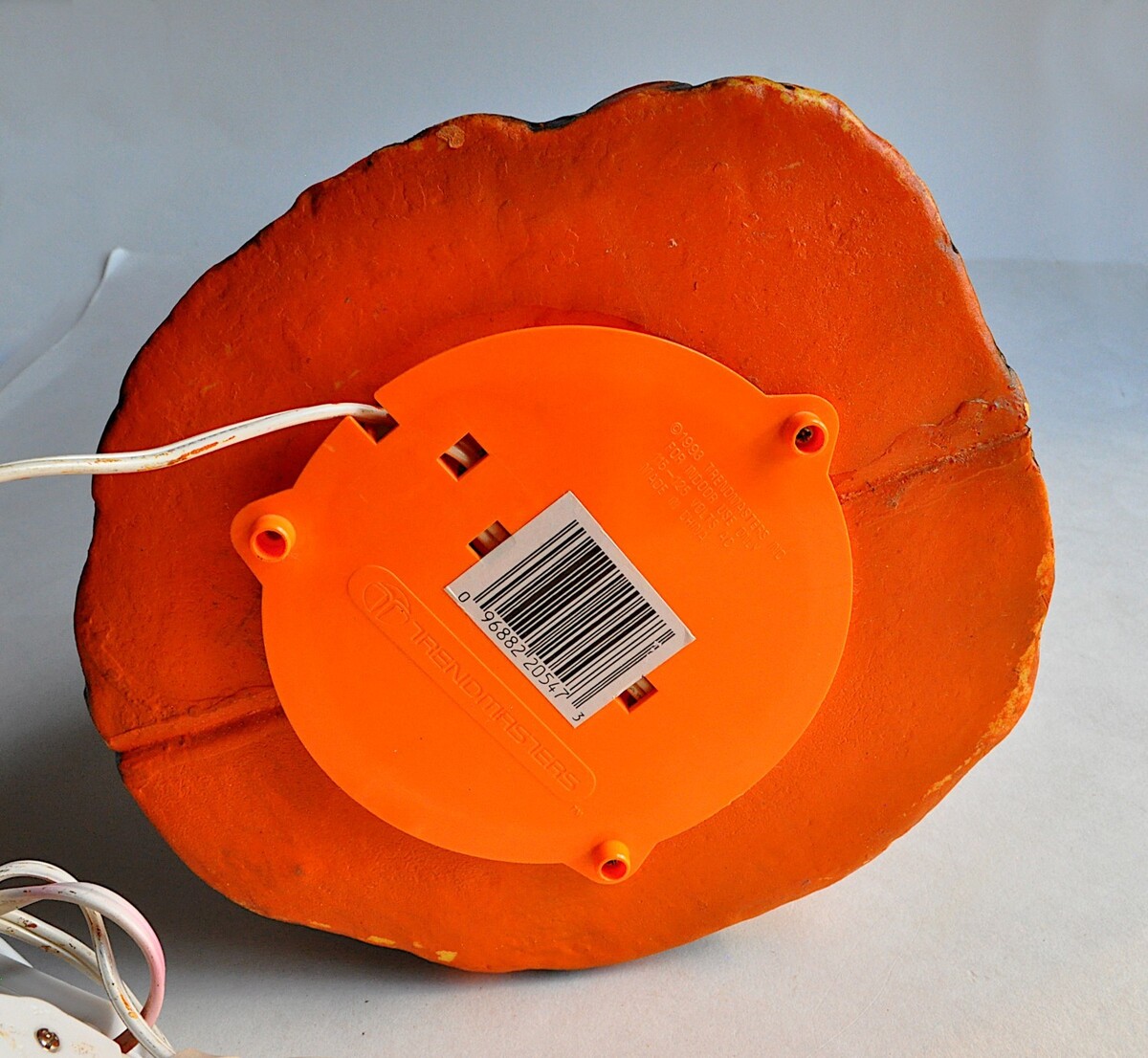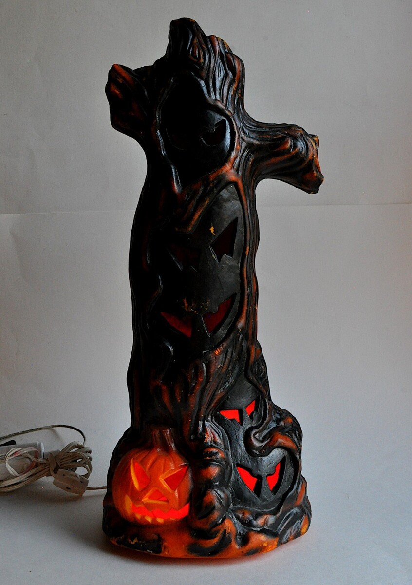 Works, but does have cosmetic damage in several places, especially the high points of the stump. Please also note that the mouth of the jack-o-lantern in the back has been chewed by a mouse, and there is a screw missing on the underside.