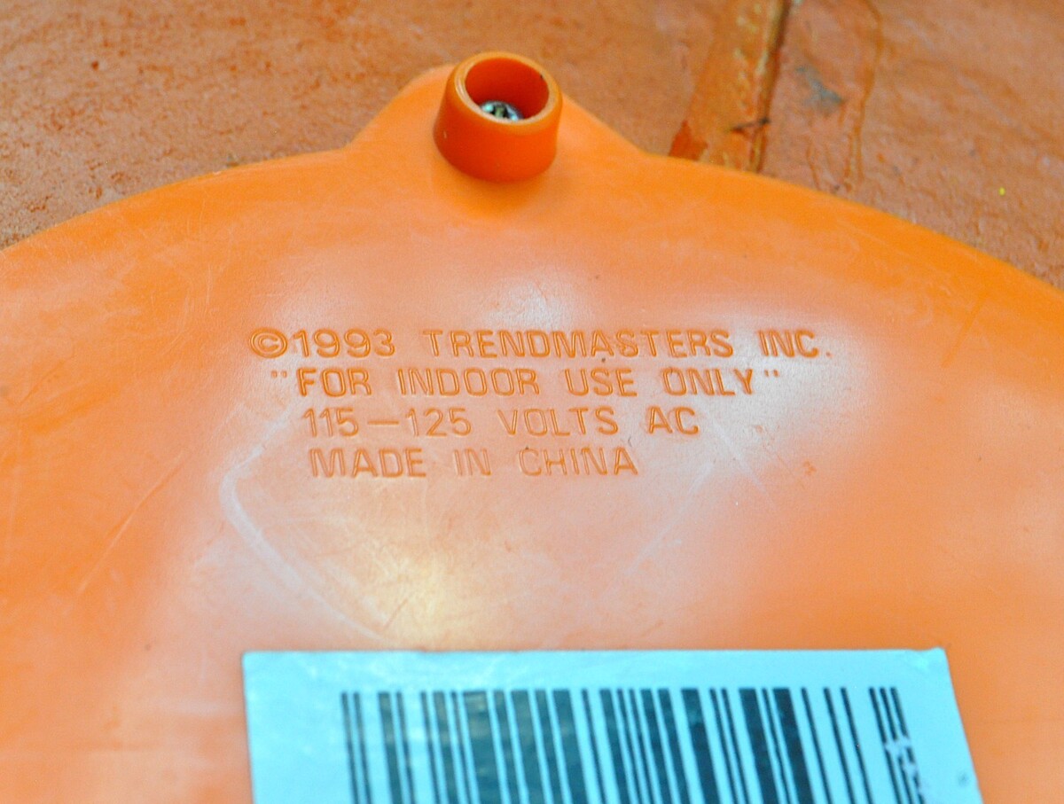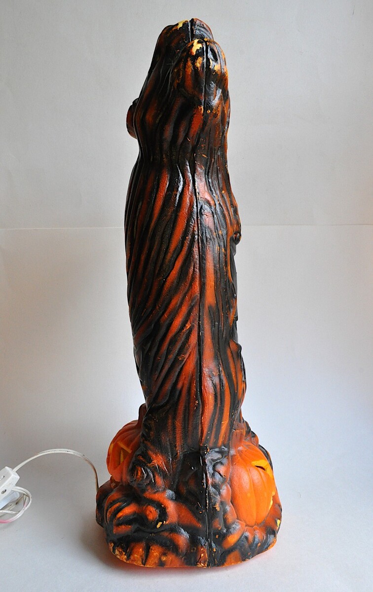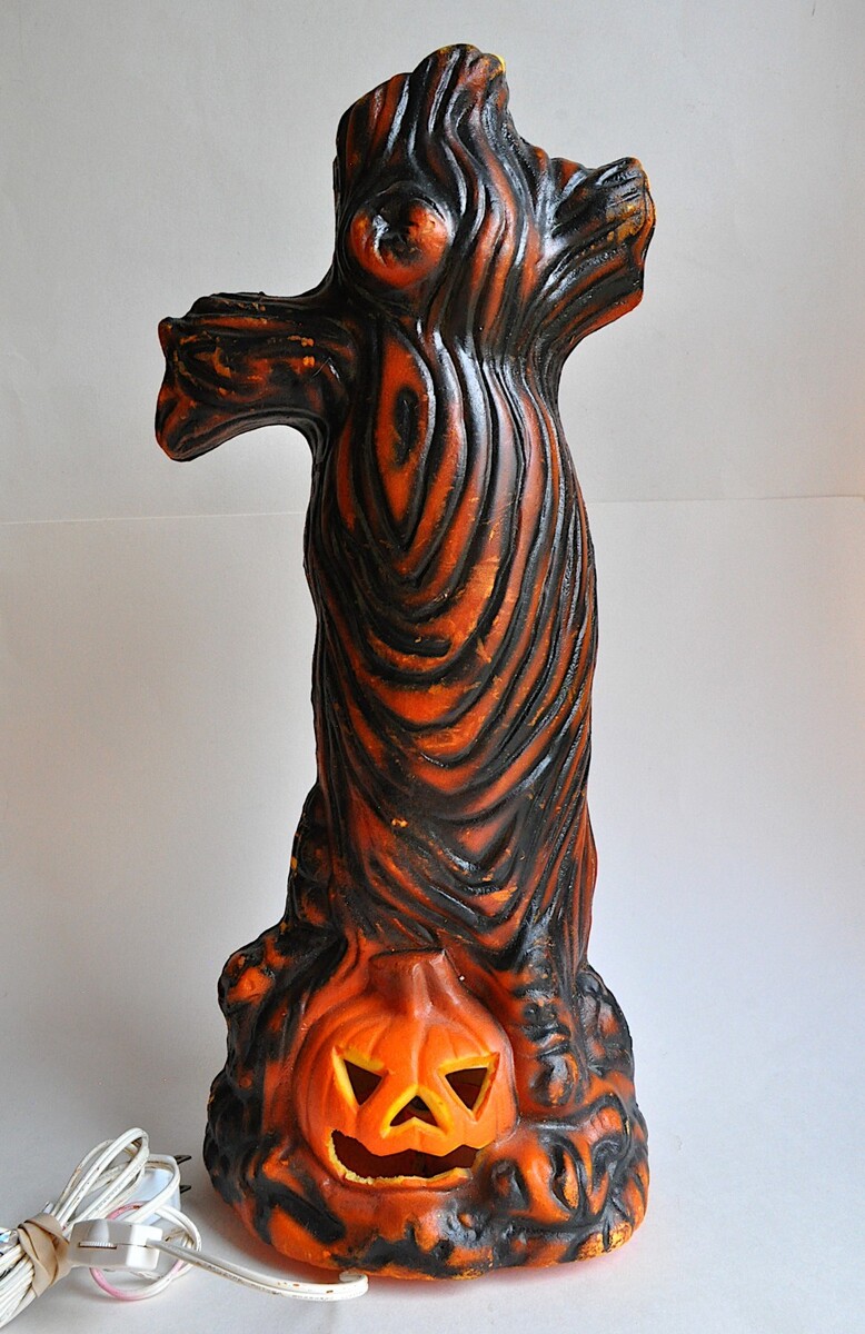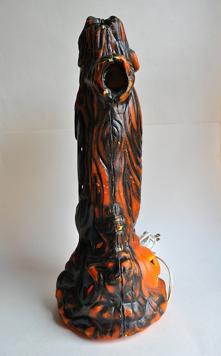 Vintage Trendmasters lighted blow mold Halloween spooky haunted hollow tree, dated 1993. Devilish eyes peer out from the darkness of a hollow tree stump, flanked by two jack-o-lanterns. 18" high; base is 7 1/2" x 7". Cord is about 5 feet long with an in-line switch. This is made of a thick styrofoam-type plastic, kinda like that Great Stuff spray insulation, rather than the usual translucent "chewy" type of plastic that most holiday blow molds are made from. The bulb has a flame-shaped filament that flickers, and it's very cool but I suspect it isn't original. IMO this needs a different bulb that fills it with more light so you can see the eyes better.