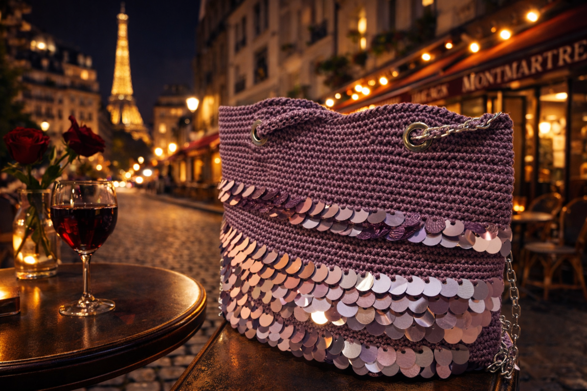 Lilac Shine is a unique crochet bag in a gorgeous lilac-purple hue, decorated with shiny sequins that add light, movement and a glamorous character.