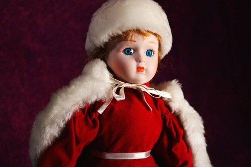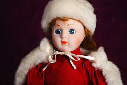 You will be receiving a beautiful porcelain doll. Elfriede is around 14-16 inches tall. Her body is stuffed and her head, neck, arms, and legs are made of porcelain. She has long, blonde hair held beneath her hat. She has bright blue eyes. And, she is wearing a deep red dress with white fur ends.