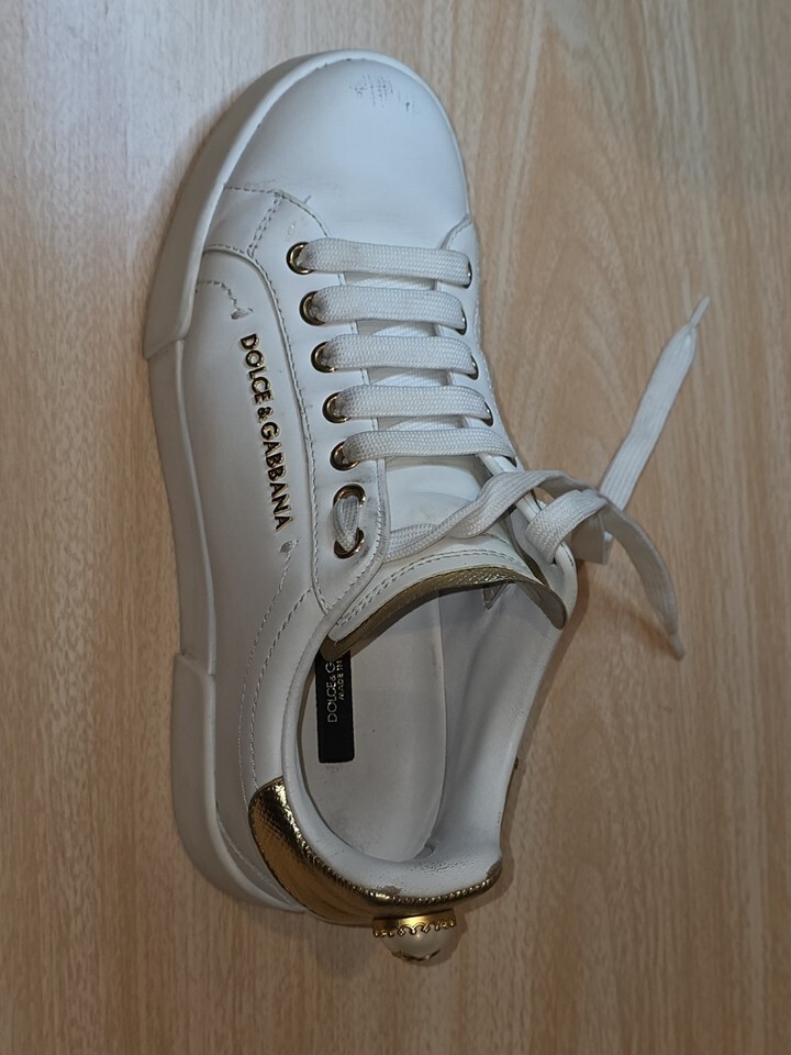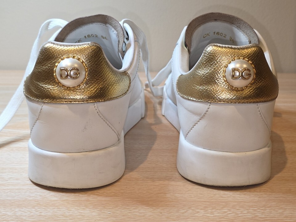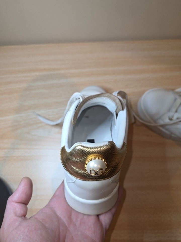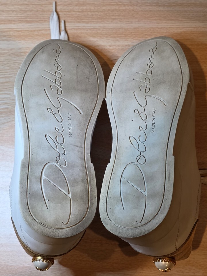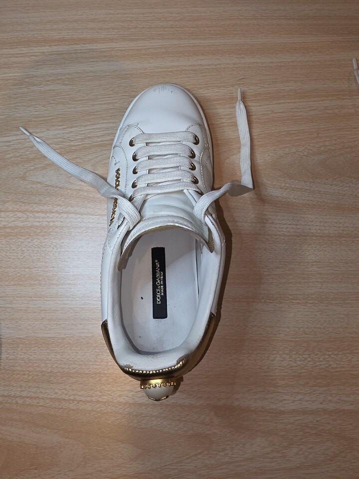 Size 6 Dolce Gabbana Faux Pearl Accents Leather Sneakers White with Gold