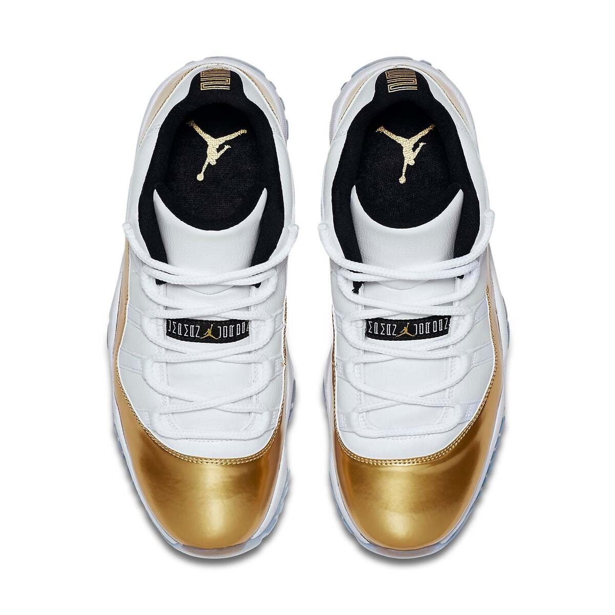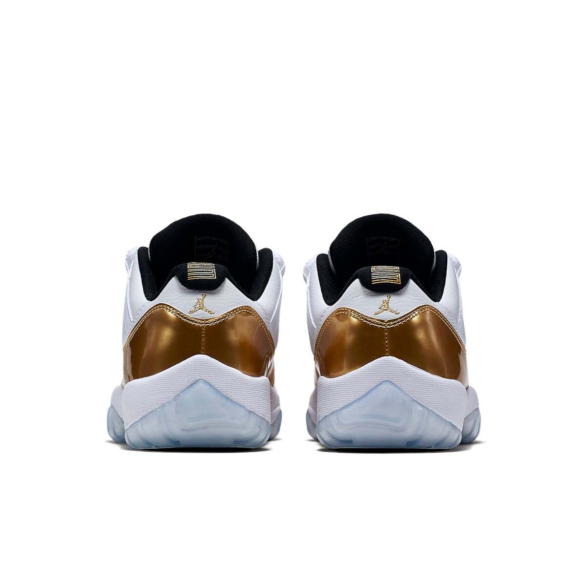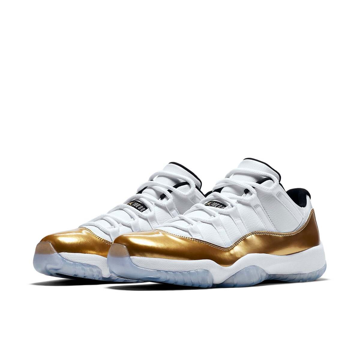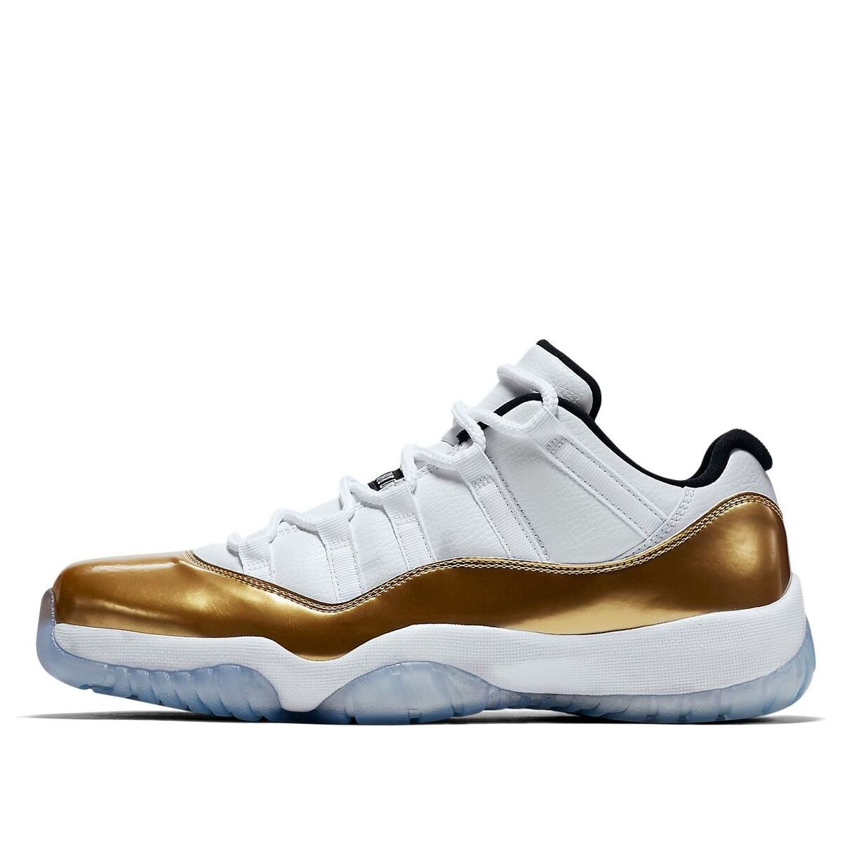 The Air Jordan 11 Retro Low 'Closing Ceremony' is a special edition shoe that was released to celebrate the Rio Summer Olympics. This shoe features a white mesh upper with gold patent leather overlays. The black accents on the inner and tongue add a nice contrast, and the ice blue translucent outsole completes the look.