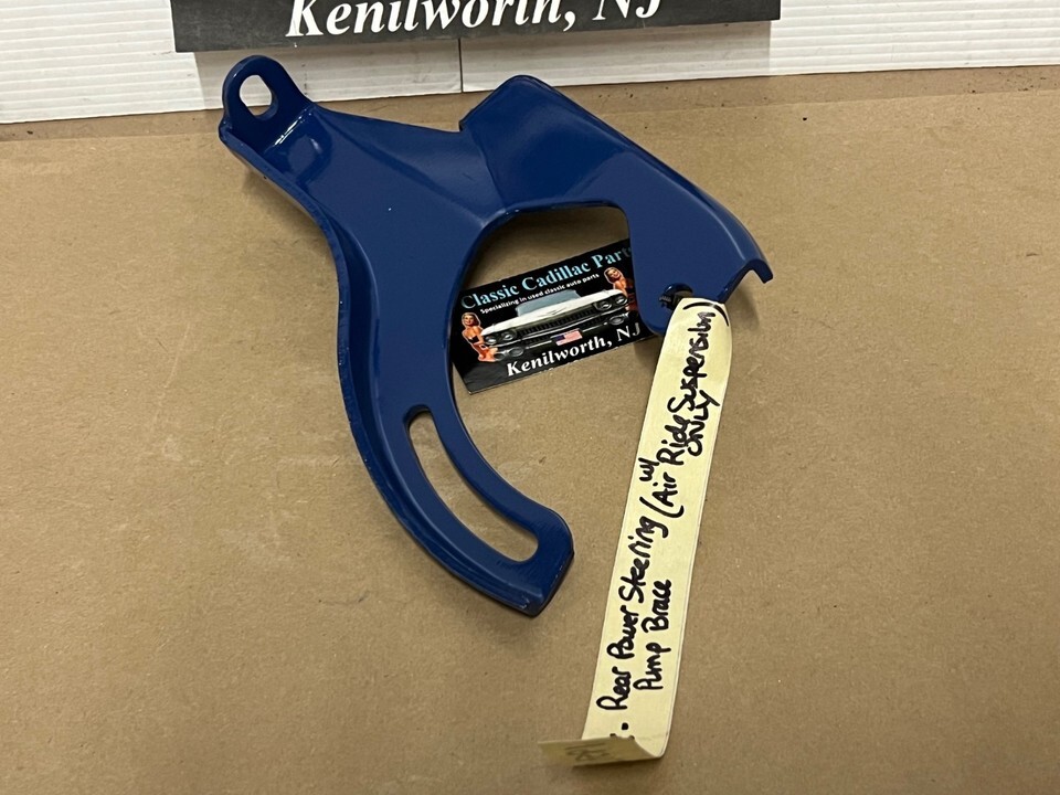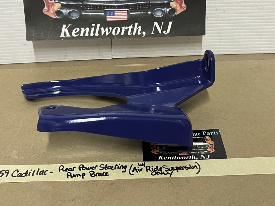 This OEM power steering pump rear brace support bracket is in excellent condition. It has been sandblasted to check for cracks and painted with Cadillac Blue engine paint. This is for 1959-1960 Cadillacs with factory Air Ride Suspension ONLY. This mounts to the rear of the pump to the exhaust manifold and cylinder head. Fully intact, no cracks. This was removed from a 1959 Cadillac, but