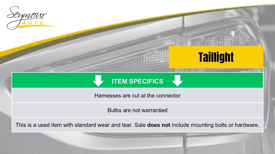 This is a Used Taillight removed from a salvage vehicle. This is sold as the Taillight Assembly only. It does not include the plug, bulb, or harness. If these items are left on, they are from convenience only and not covered by our warranty. You are covered by our 6 Month Part Warranty. LEFT IS DRIVERS SIDE AND RIGHT IS THE PASSENGERS SIDE. This taillight has been inspected and is functional, however it may have slight scuffs, scratches, or blemishes. Please contact us with any questions your may have!******* SAME DAY SHIPPING ********